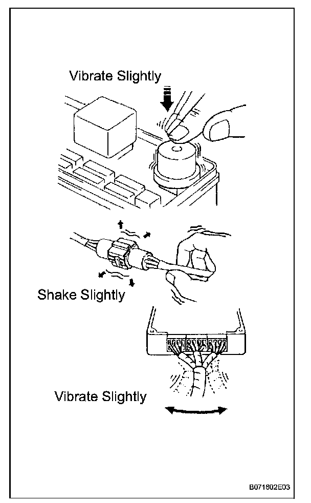 For example: With a problem that only occurs when the engine is cold or as a result of vibration caused by the road during driving, the problem can never be determined if the symptoms are being checked on a stationary vehicle or a vehicle with a warmed-up engine. Vibration, heat or water penetration (moisture) is difficult to reproduce. The symptom simulation tests below are effective substitutes for the conditions and can be applied on a stationary vehicle. Important points in the symptom simulation test: