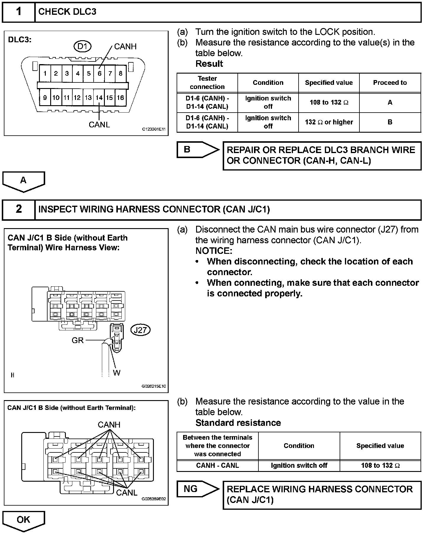 The CAN main bus wire must be disconnected when the resistance between terminals 6 (CANH) and 14 (CANL) of the DLC3 is more than 69 ohms.