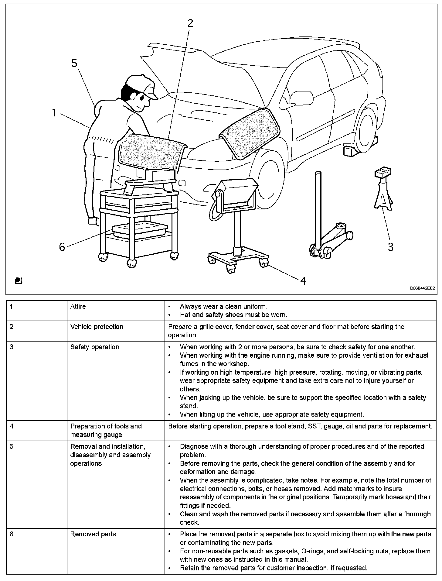 1. Care must be taken when jacking up and supporting the vehicle. Be sure to lift and support the vehicle at the proper locations.