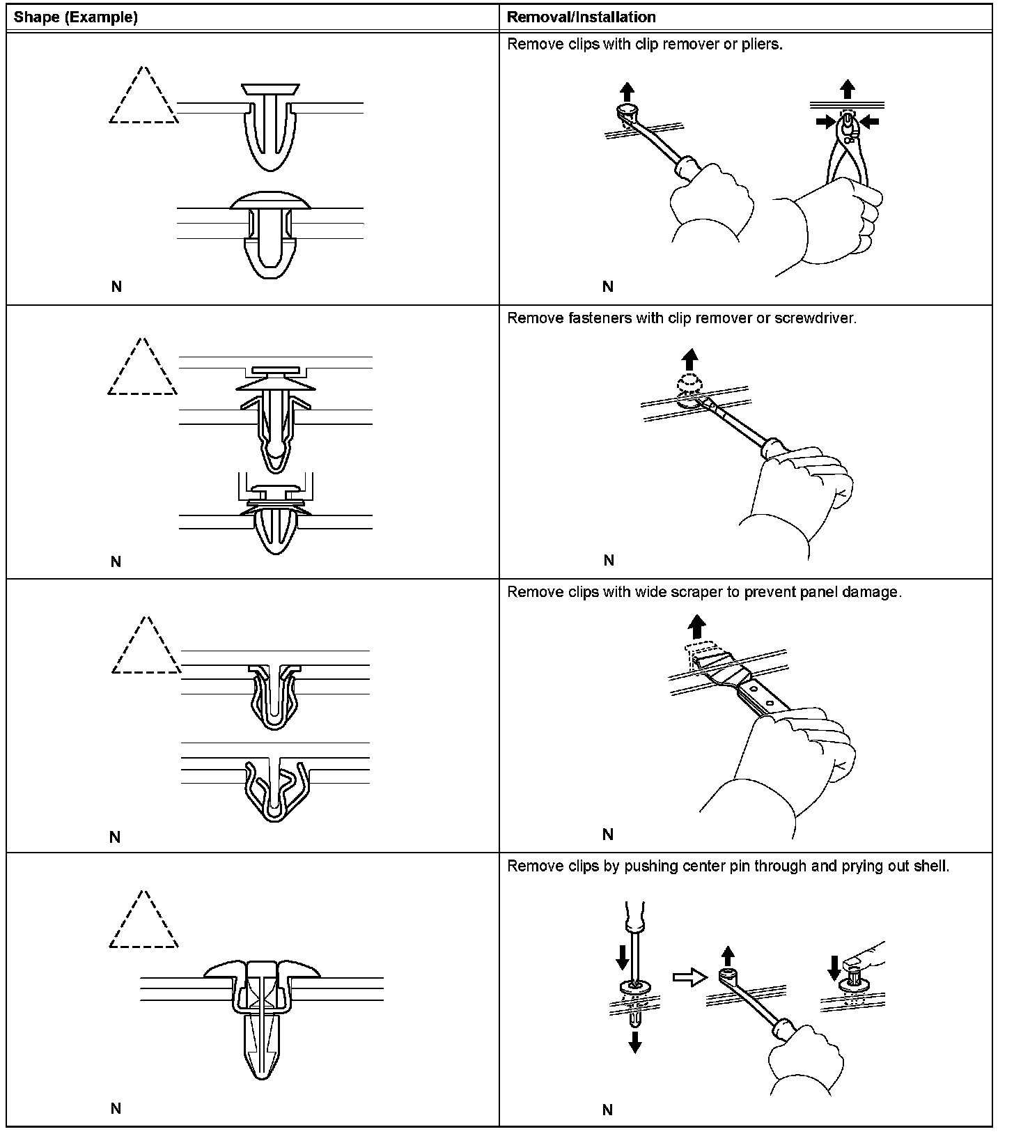 1. The removal and installation methods of typical clips used for vehicle body parts are shown in the table.