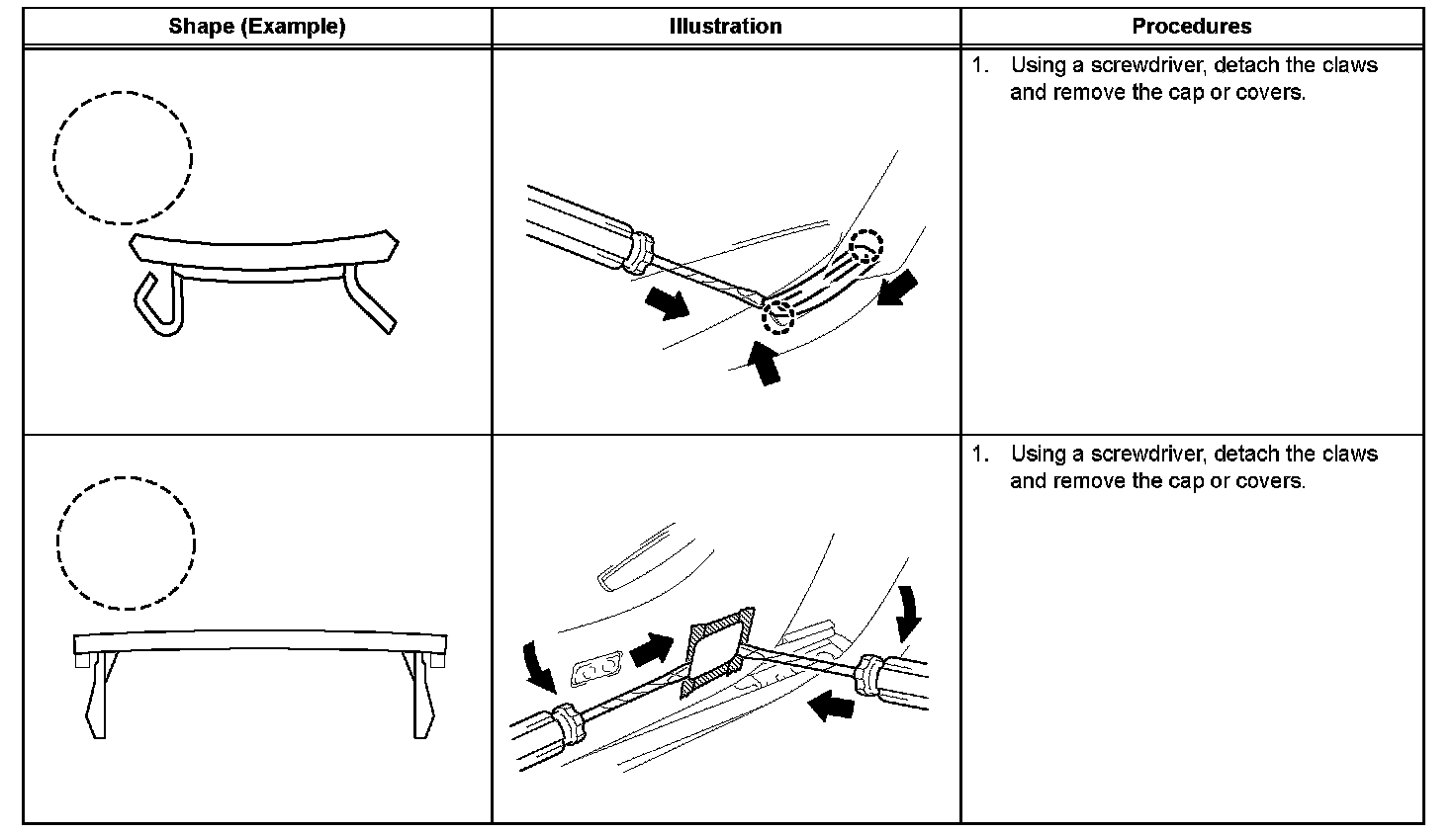 1. The removal and installation methods of typical claws used for vehicle body parts are shown in the table.