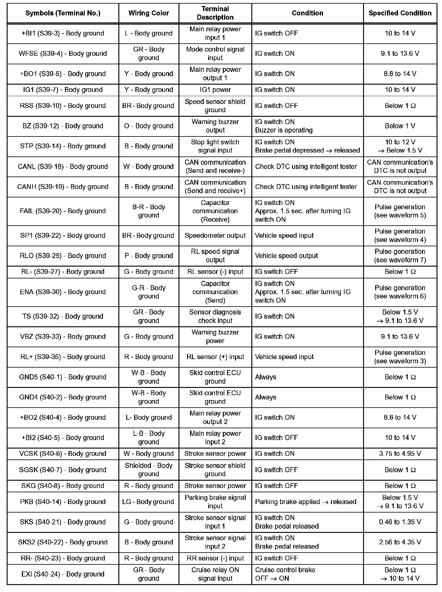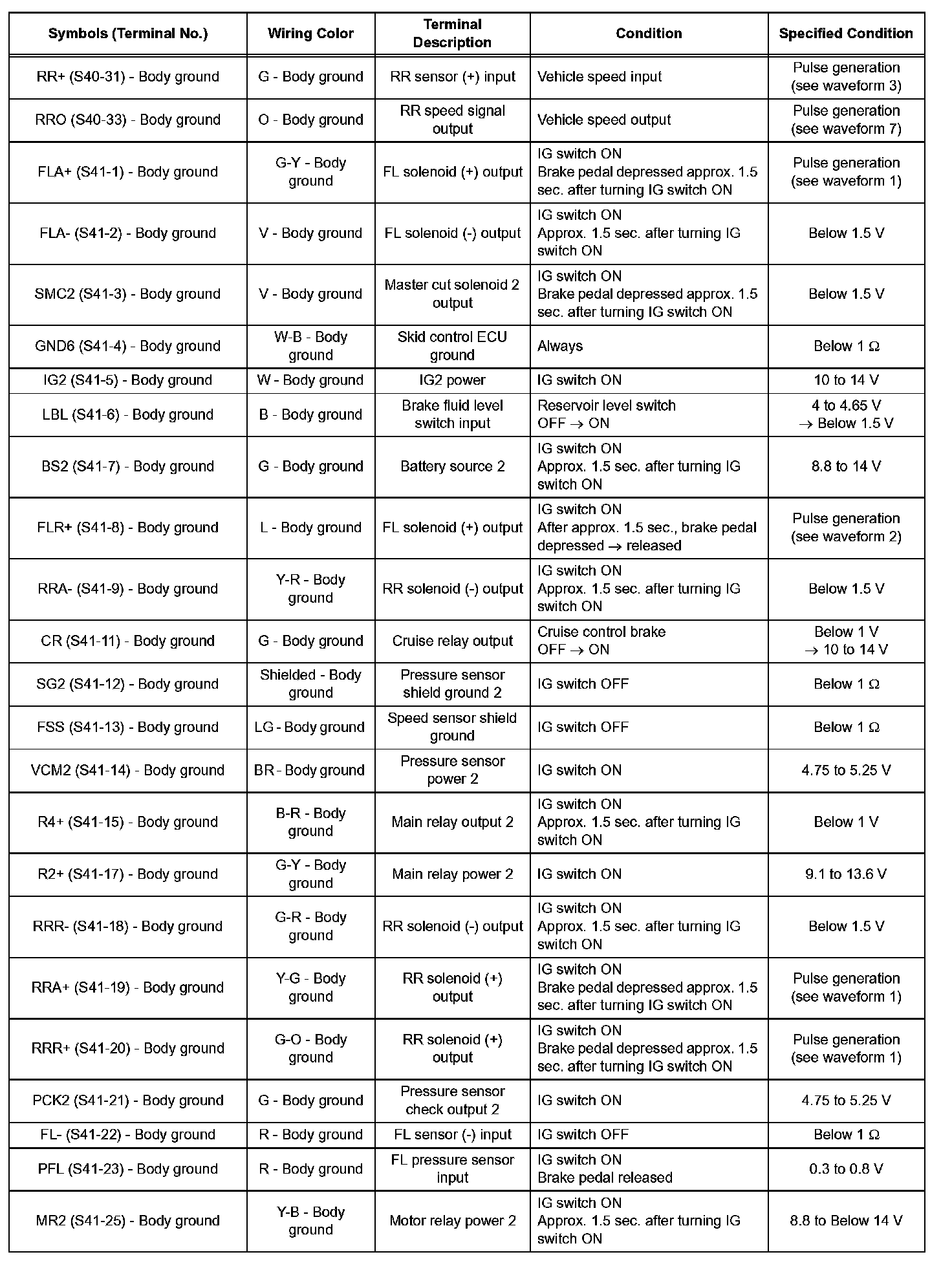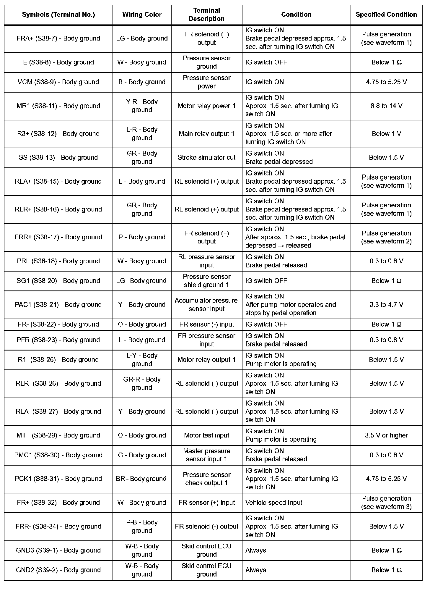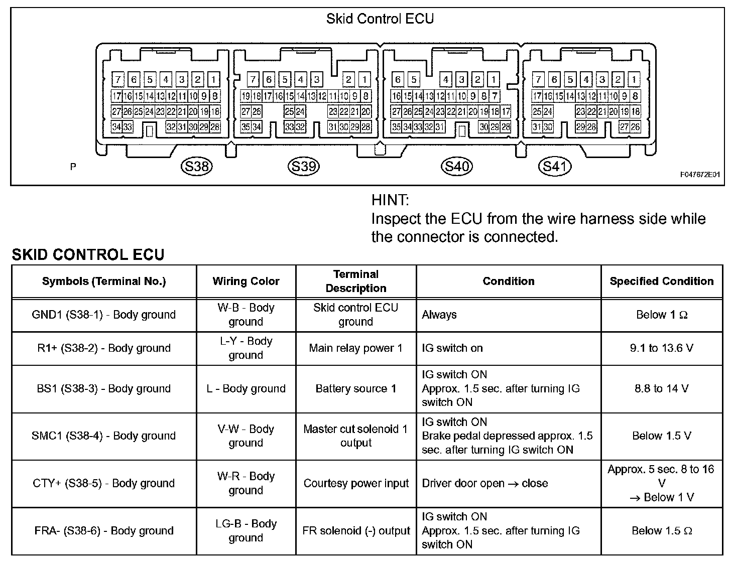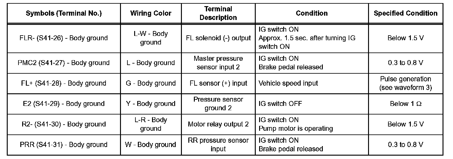 - Inspection should be performed from the back of the connector with the connector connected to the skid control ECU.