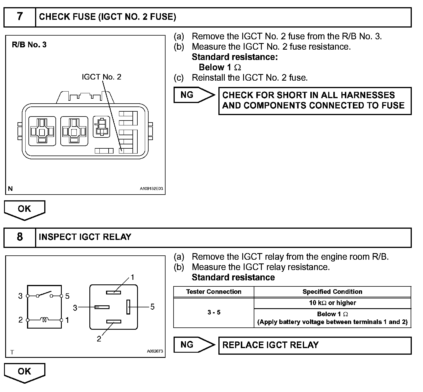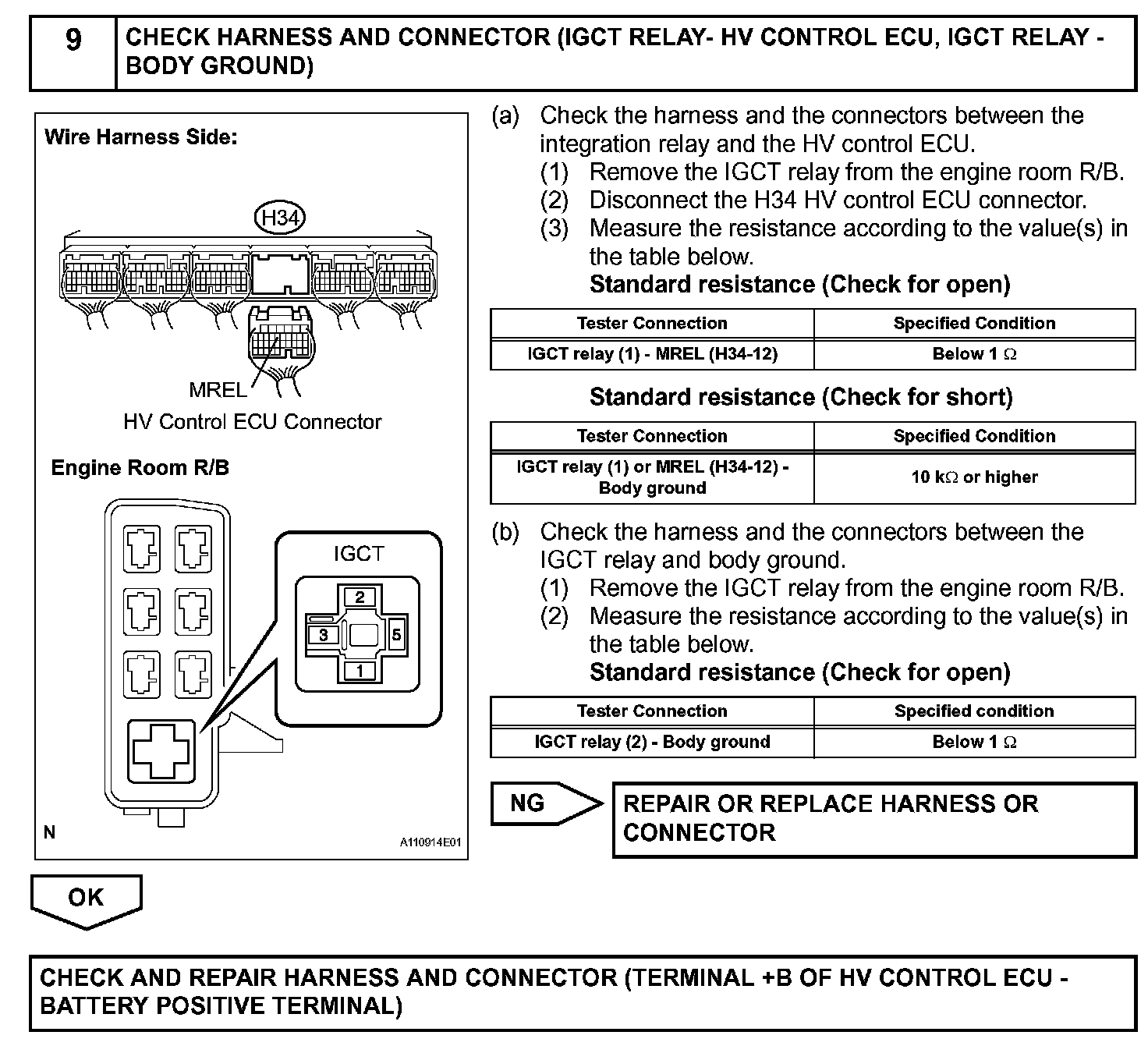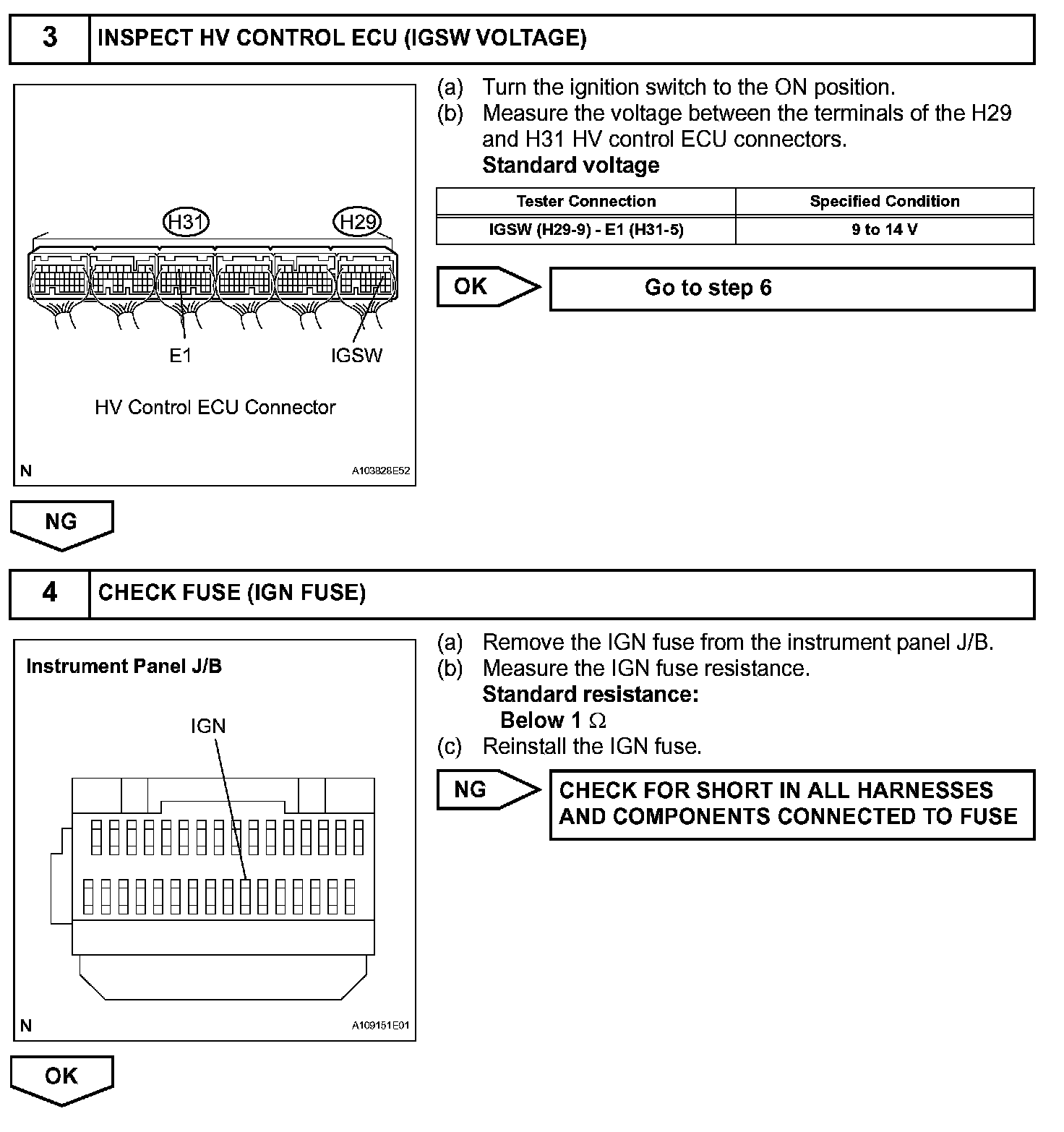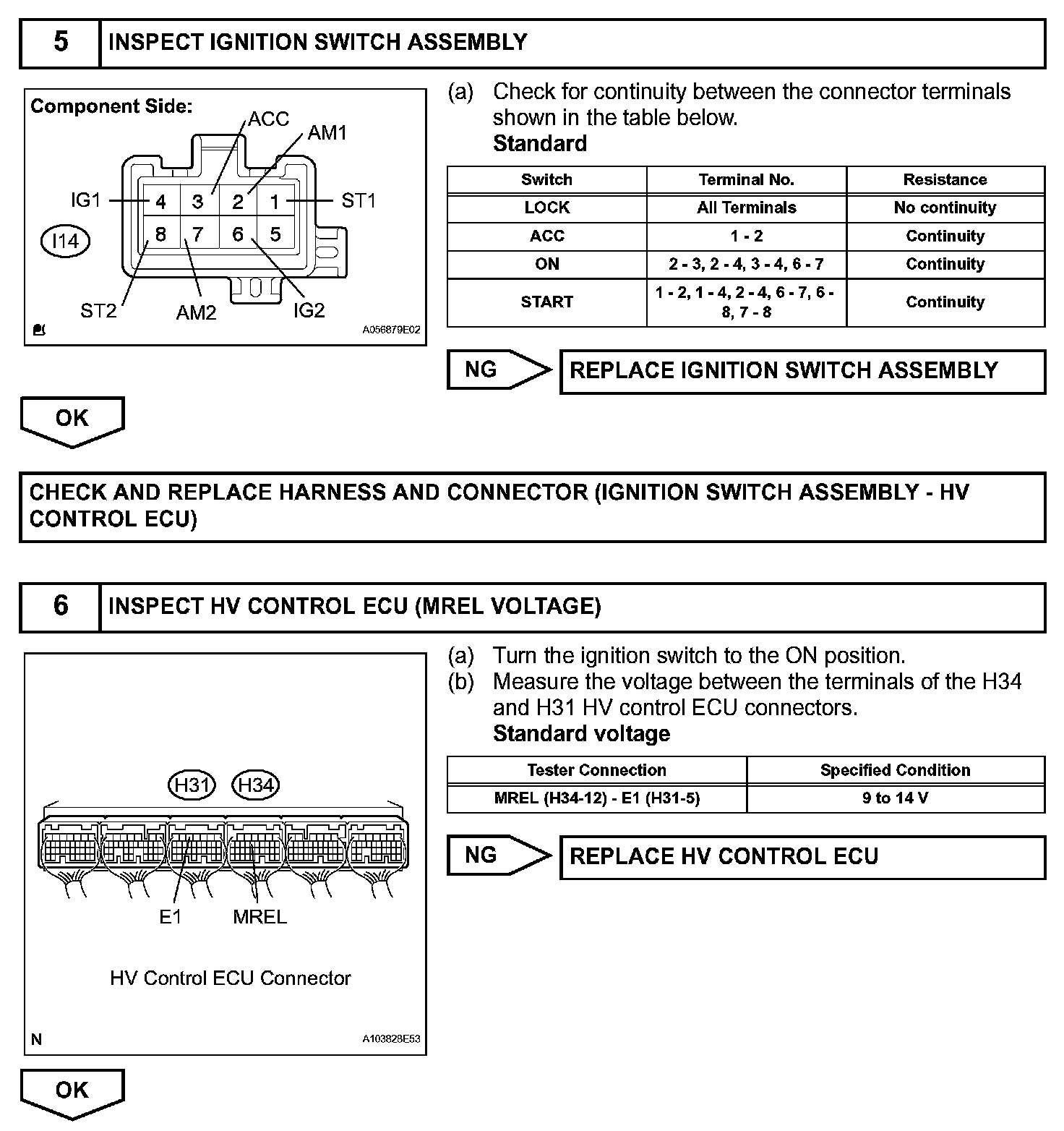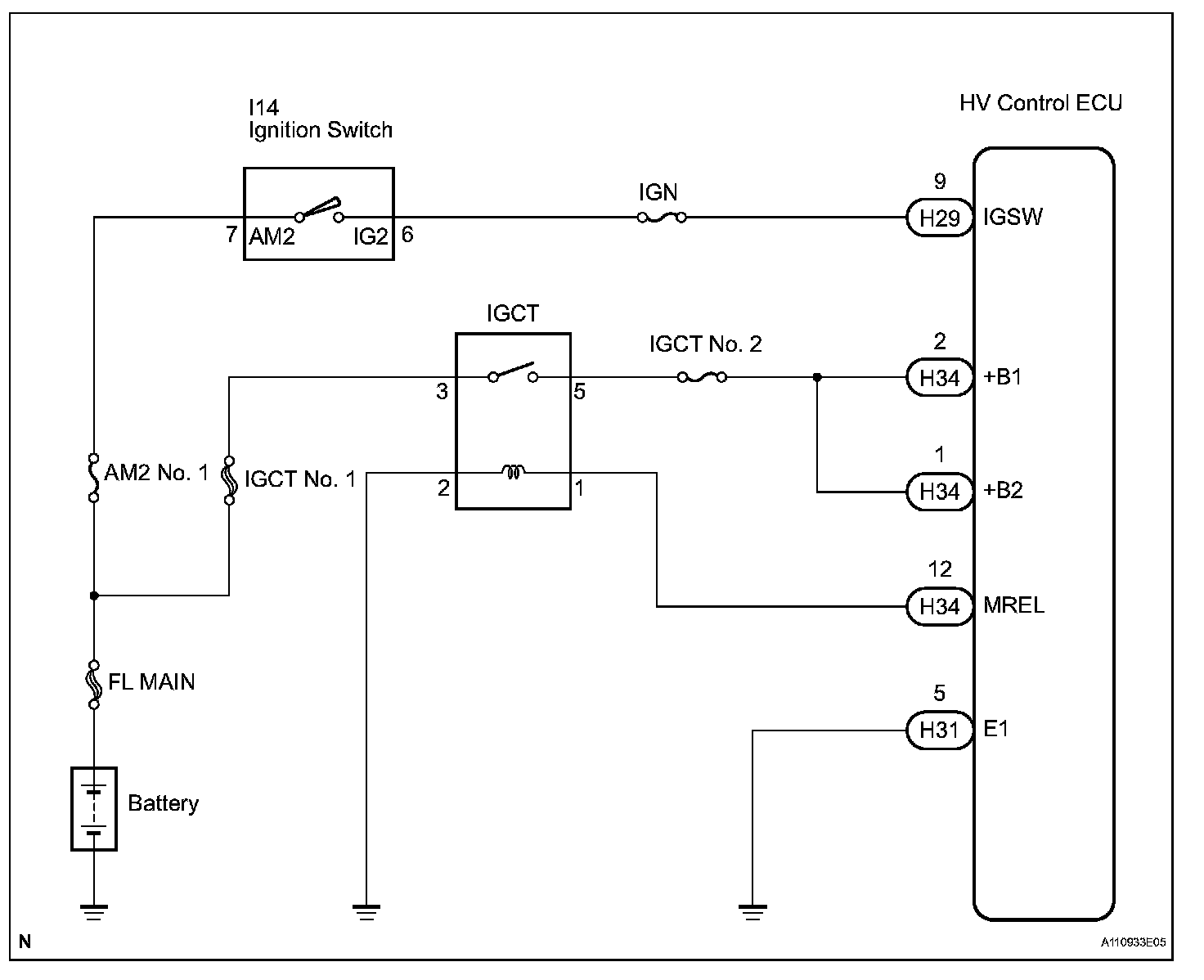 When the ignition switch is turned to the ON position, the battery voltage is applied to terminal IGSW of the ECM (Included in HV control ECU). The ECM MREL output signal causes a current to flow to the coil, closing the contacts of the IGCT relay and supplying power to terminal +B of the ECM.