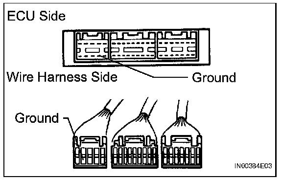 2. Disconnect the ECU connector. Check the ground terminal on the ECU side and wire harness side for bending, corrosion or foreign matter. Lastly, check the contact pressure of the female terminals.