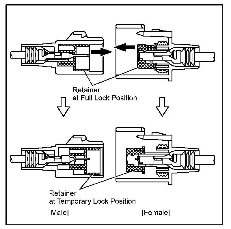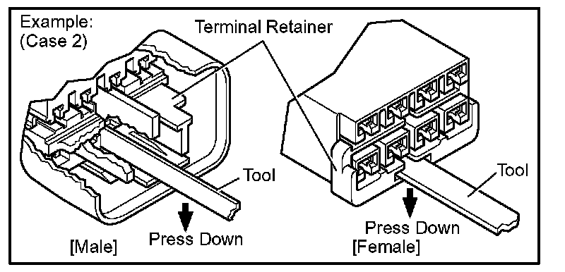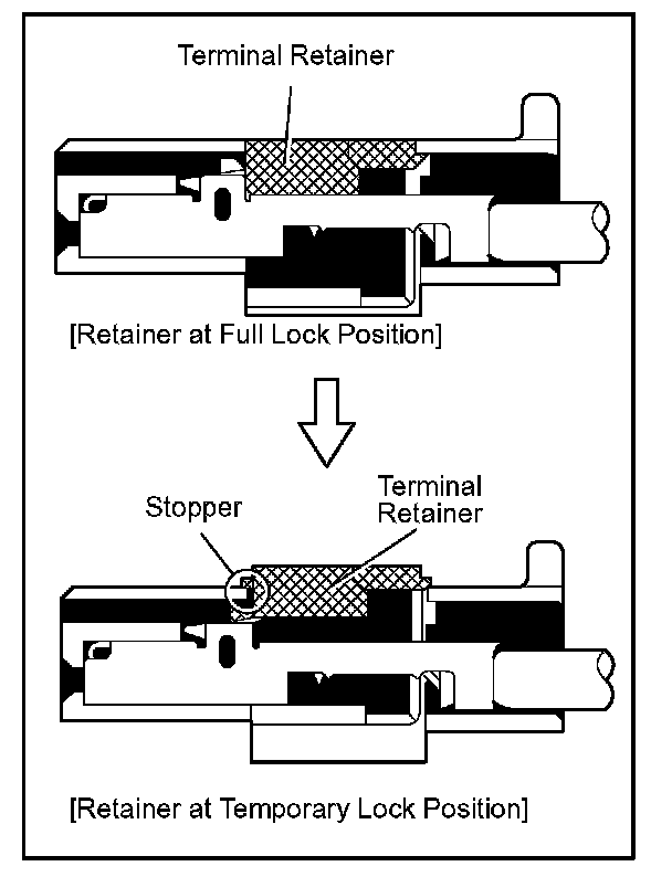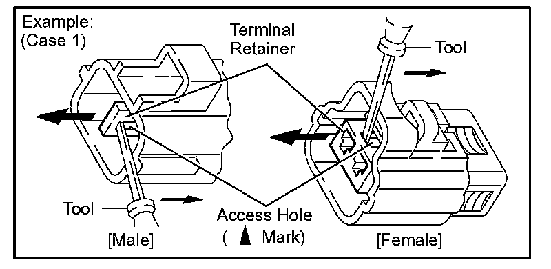 Insert the special tool into the terminal retainer access hole ( Mark) and pull the terminal retainer up to the temporary lock position.