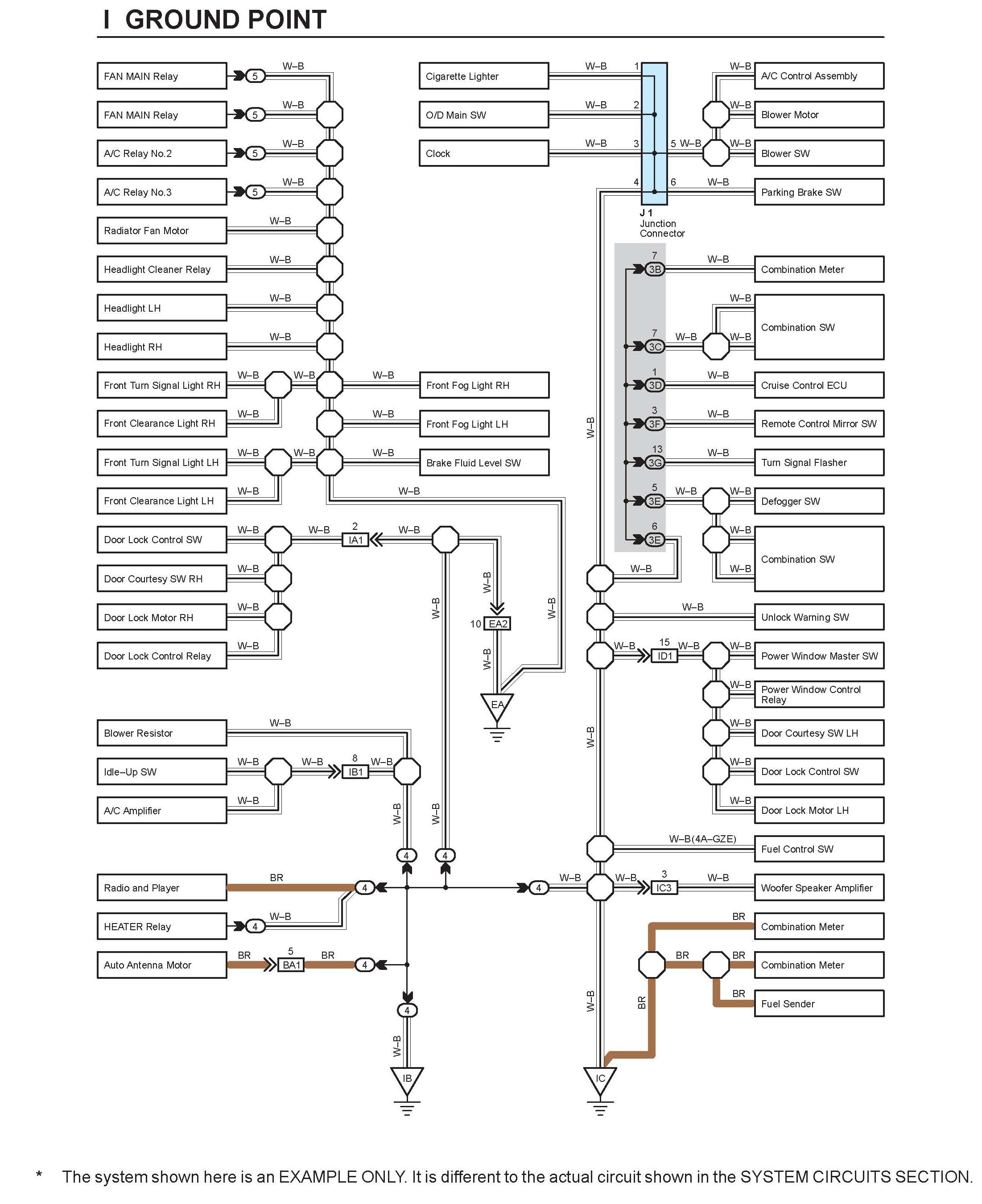 The ground points circuit diagram shows the connections from all major parts to the respective ground points. When troubleshooting a faulty ground point, checking the system circuits which use a common ground may help you identify the problem ground quickly. The relationship between ground points (EA, IB and IC shown) can also be checked this way.