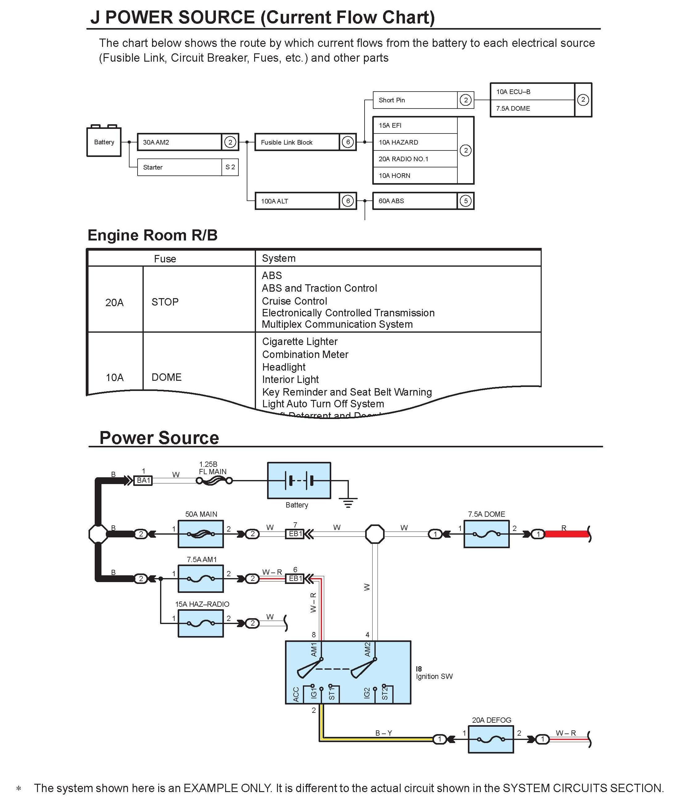 The "Current Flow Chart", describes which parts each power source (fuses, fusible links, and circuit breakers) transmits current to. In the Power Source circuit diagram, the conditions when battery power is supplied to each system are explained. Since all System Circuit diagrams start from the power source, the power source system must be fully understood.