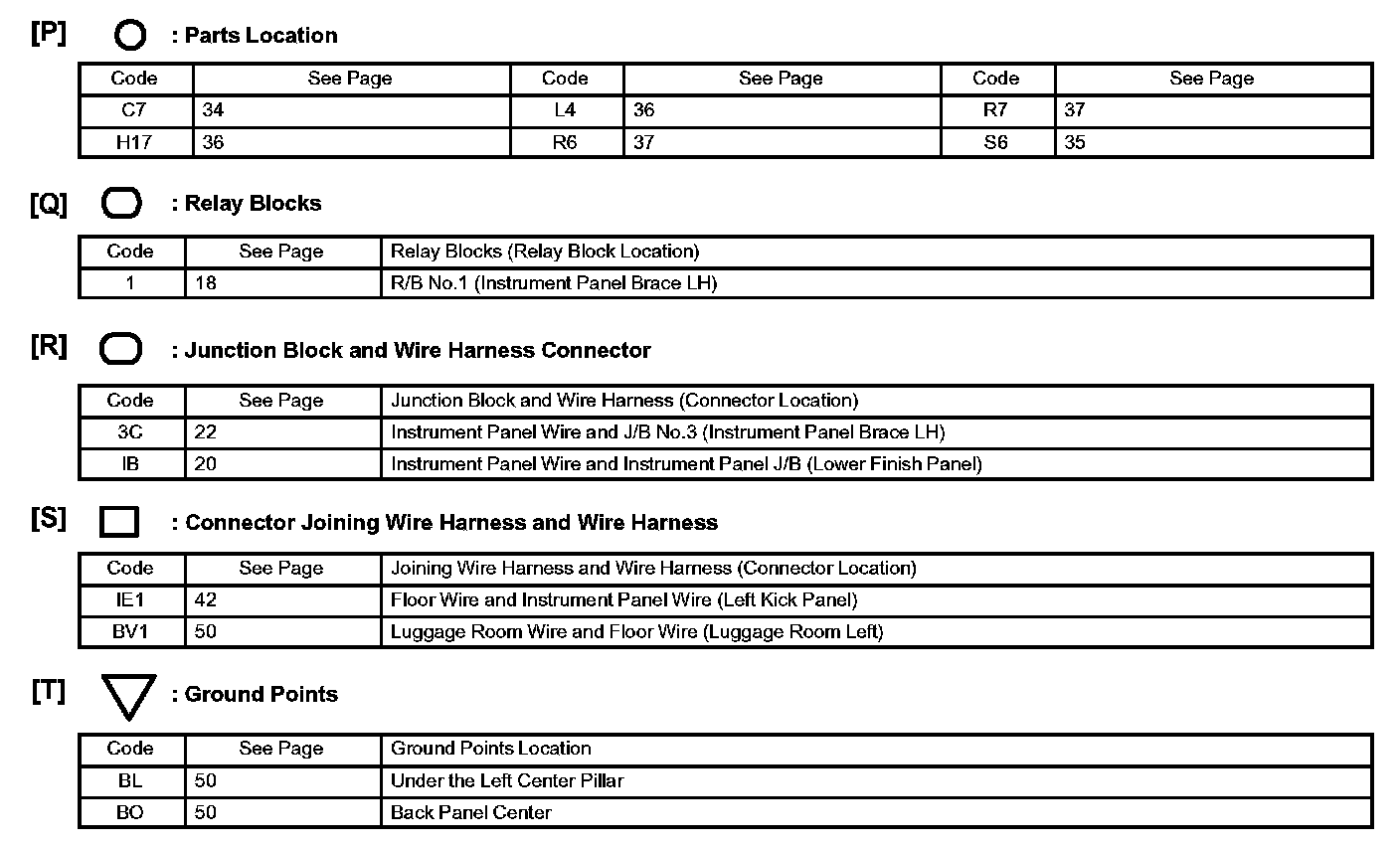 The first letter of the code for each ground point(s) indicates the component's location, e.g, "E" for the Engine Compartment, "I" for the Instrument Panel and Surrounding area, and "B" for the Body and Surrounding area.