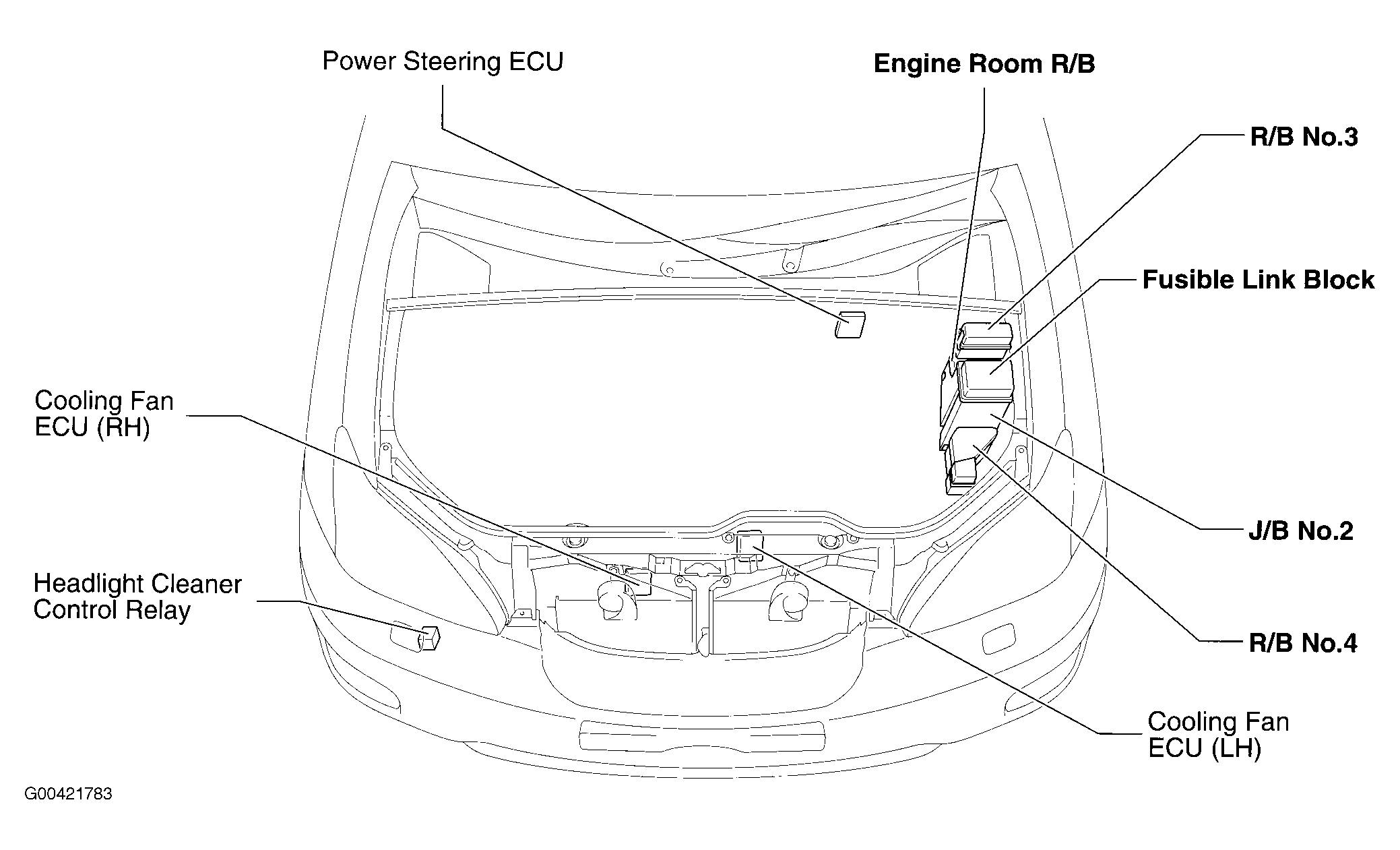 | Engine Room R/B | On left side of engine compartment. See Figure. |