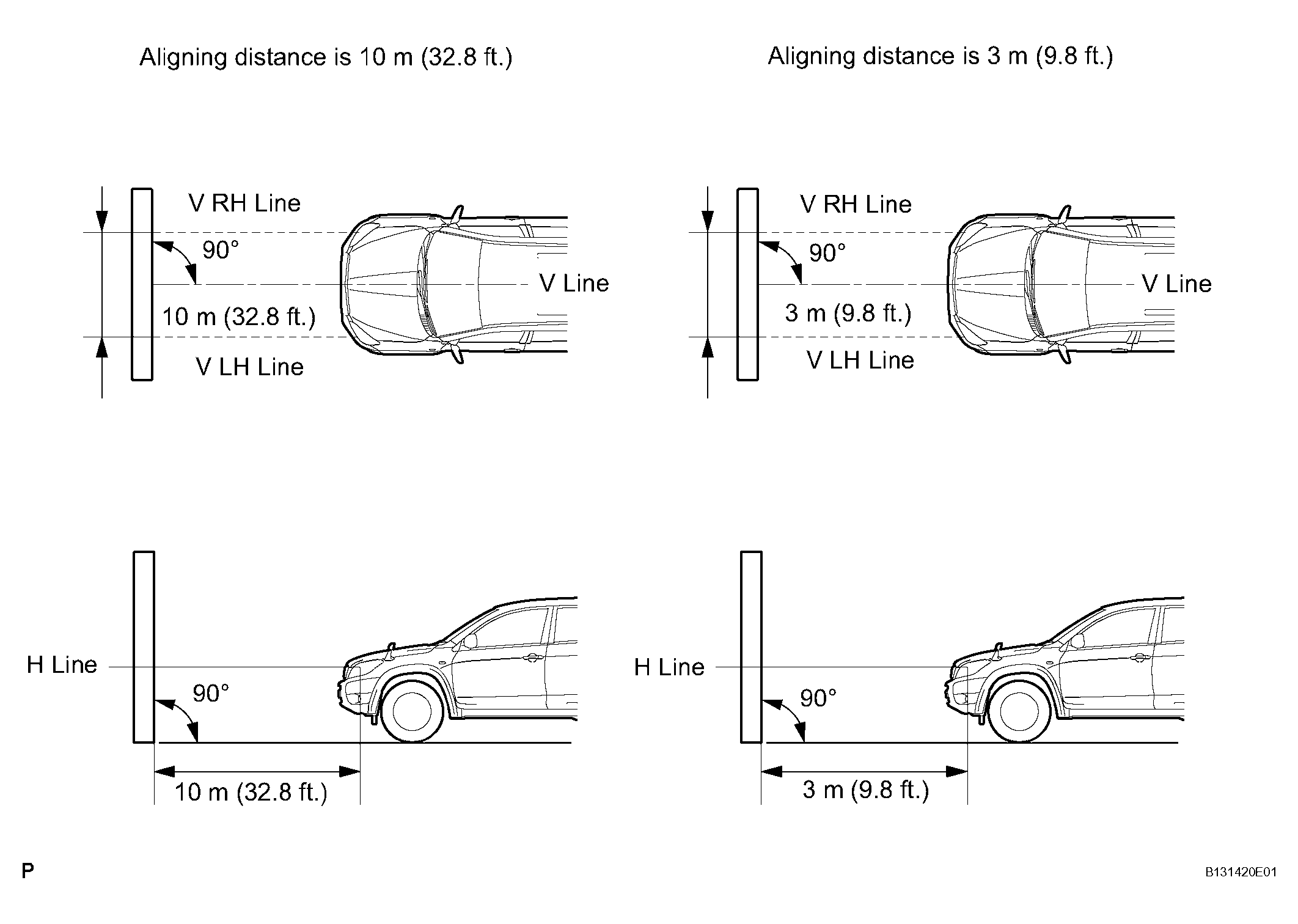 A distance of 10 m (32.8 ft.) between the vehicle and the wall is necessary for proper aim adjustment. If unavailable, secure a distance of exactly 3 m (9.8 ft.). In the illustrations below, view the part of the illustration applicable to the distance from the vehicle to the wall.
