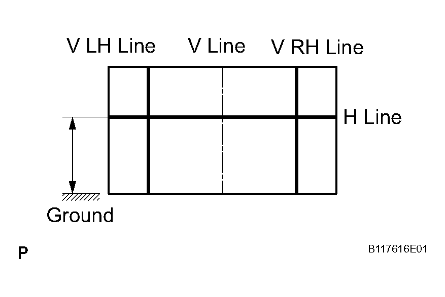 Draw a horizontal line across the screen so that it passes through the center marks. The H line should be at the same height as the headlight bulb center marks of the lo beam headlights.