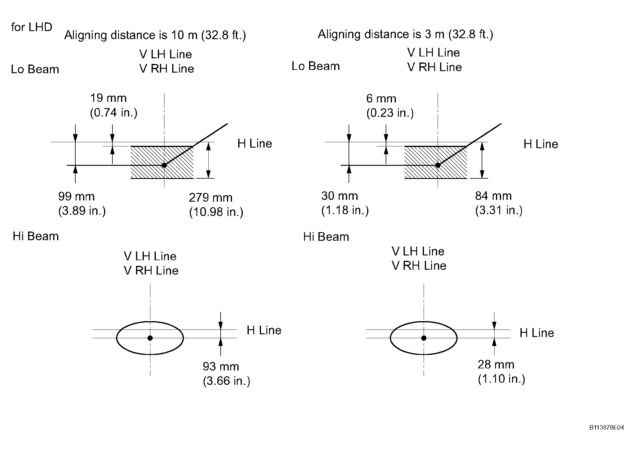 - V LH line, V RH line (center mark position of LH and RH headlights):