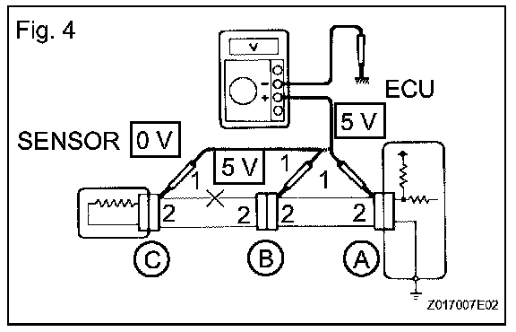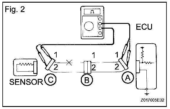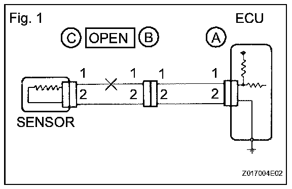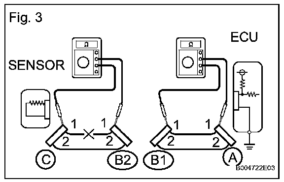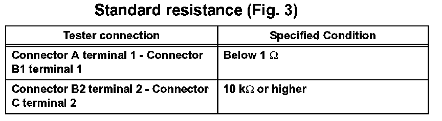 HINT: Measure the resistance while lightly shaking the wire harness vertically and horizontally. If the results match the examples above, an open circuit exists between terminal 1 of connector A and terminal 1 of connector C.