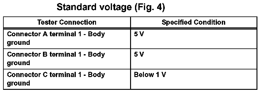 1. In a circuit in which voltage is applied to the ECU connector terminal, an open circuit can be checked by conducting a voltage check. With each connector still connected, measure the voltage between the body ground and these terminals (in this order): 1) terminal 1 of connector A, 2) terminal 1 of connector B, and 3) terminal 1 of connector C.