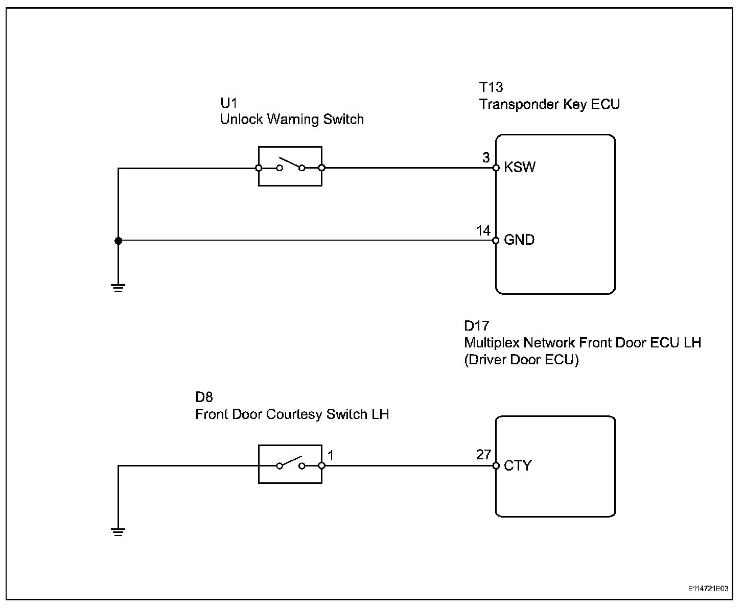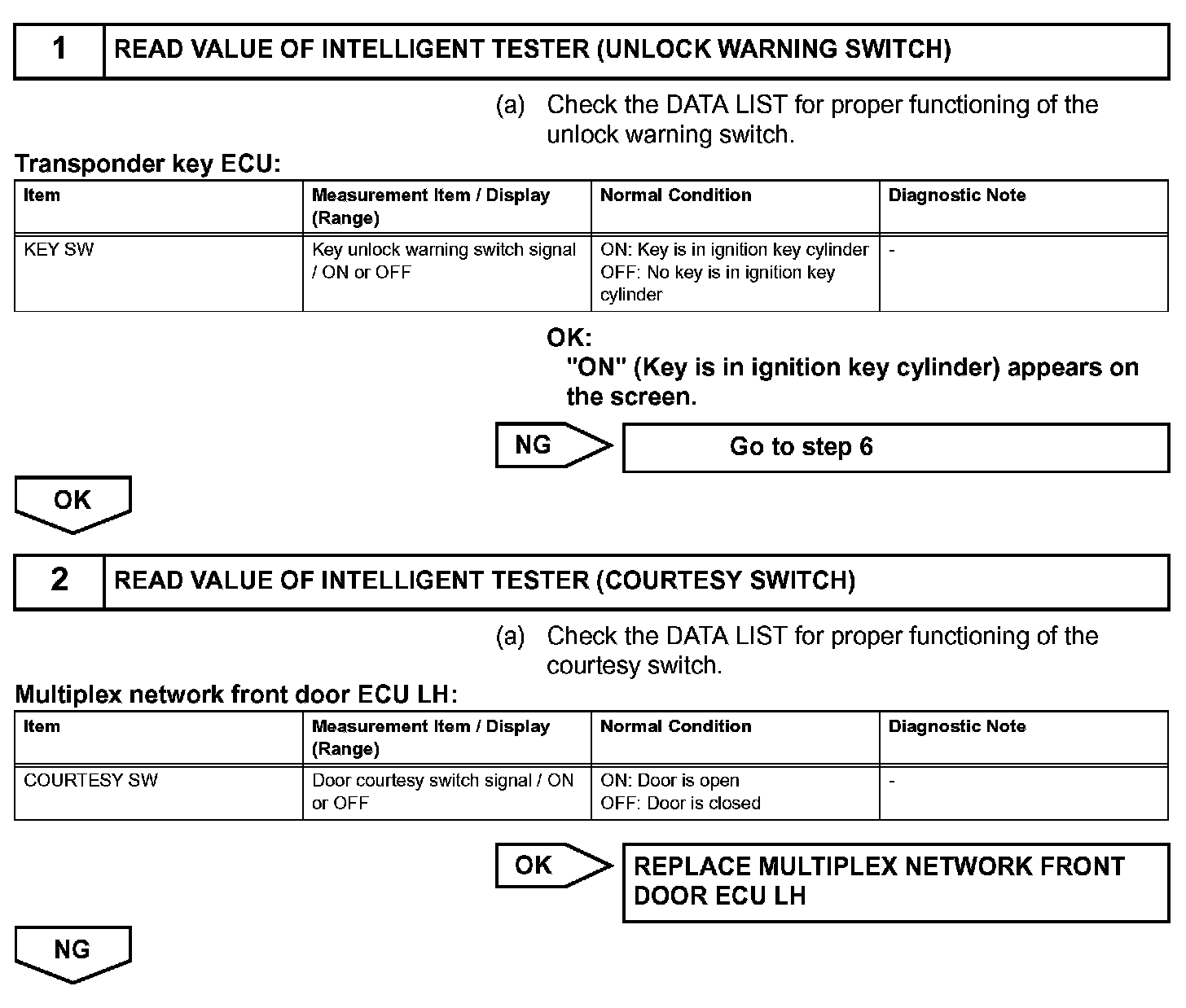 The transponder key ECU uses the unlock warning switch to detect when the key is in the ignition key cylinder, and transmits the detection as a signal to the theft warning ECU. When the door is locked with the ignition switch OFF and the key in the ignition key cylinder, the theft warning ECU transmits the LOCK signal. Then the UNLOCK signal is sent to the multiplex network door ECU front LH and RH. After those operations, the multiplex network front door ECU LH and RH drive the door lock motor.