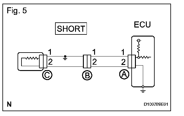 HINT: Measure the resistance while lightly shaking the wire harness vertically and horizontally. If the results match the examples above, a short circuit exists between terminal 1 of connector A and terminal 1 of connector C.