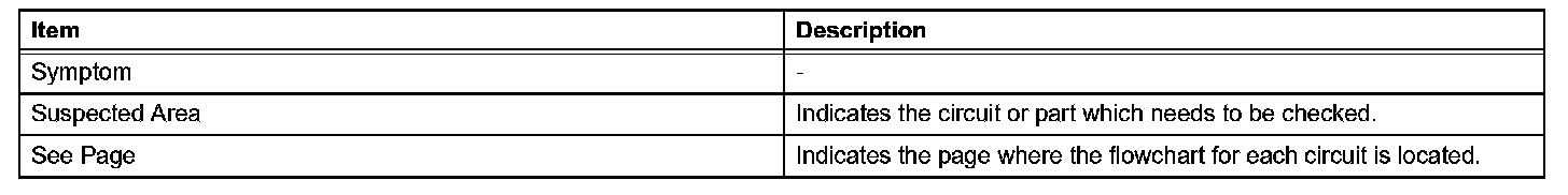 PROBLEM SYMPTOMS TABLEWhen a "Normal" code is output during a DTC check but the problem is still occurring, use the Problem Symptoms Table. The suspected areas (circuits or parts) for each problem symptom are in the table. The suspected areas are listed in order of probability. A description of each of the chart's columns is given.