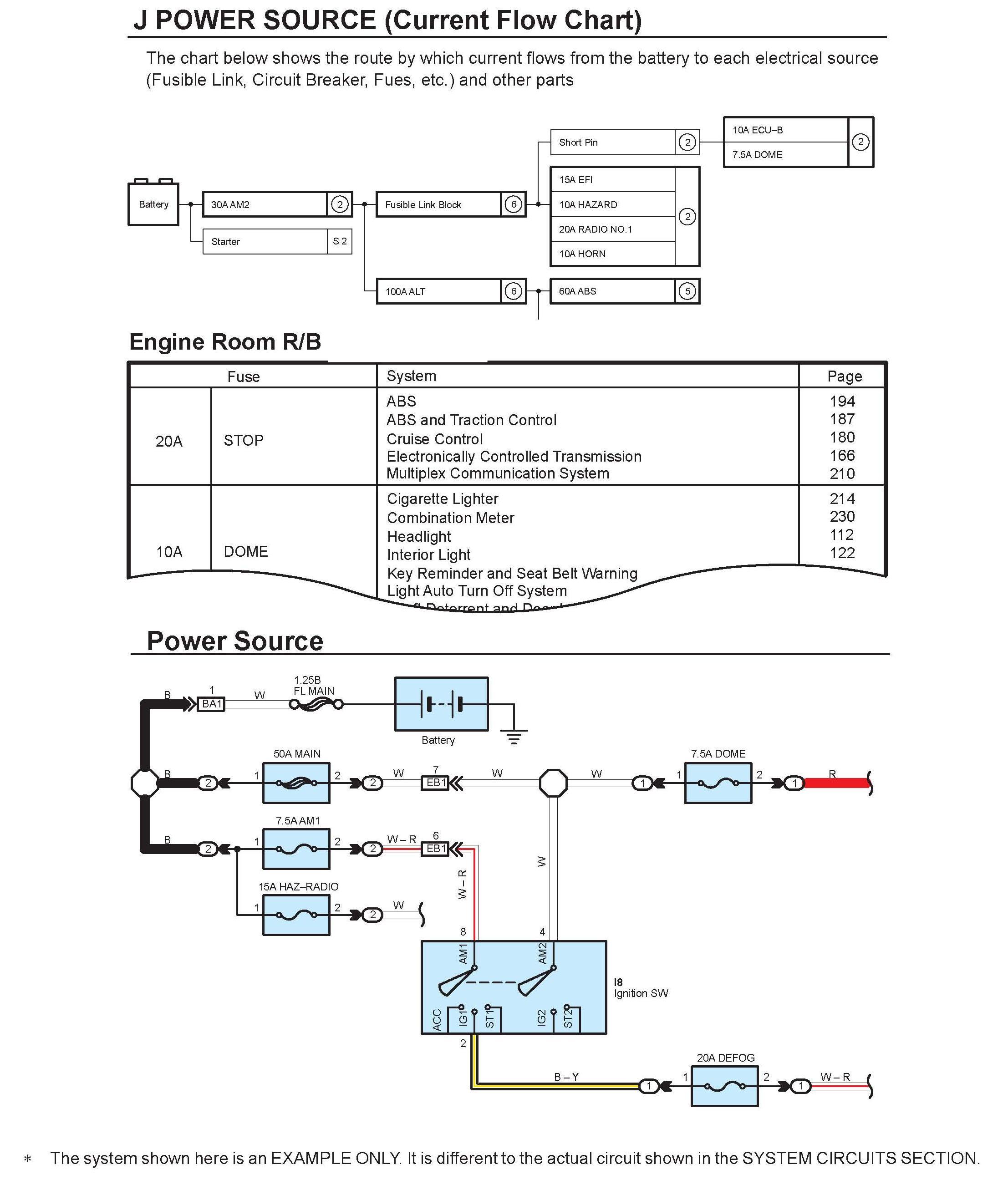 HOE TO READ POWER SOURCEThe "Current Flow Chart", describes which parts each power source (fuses, fusible links, and circuit breakers) transmits current to. In the Power Source circuit diagram, the conditions when battery power is supplied to each system are explained. Since all System Circuit diagrams start from the power source, the power source system must be fully understood.