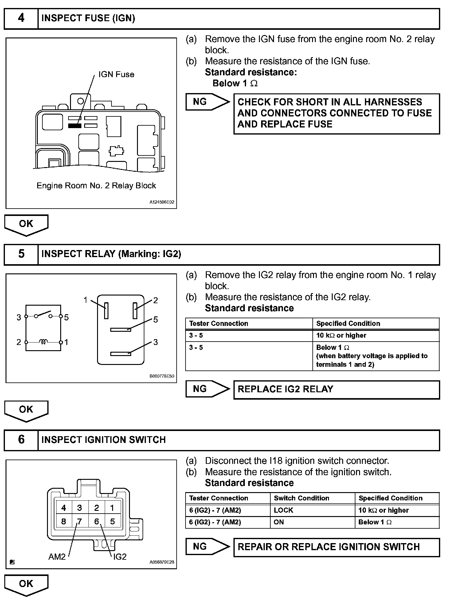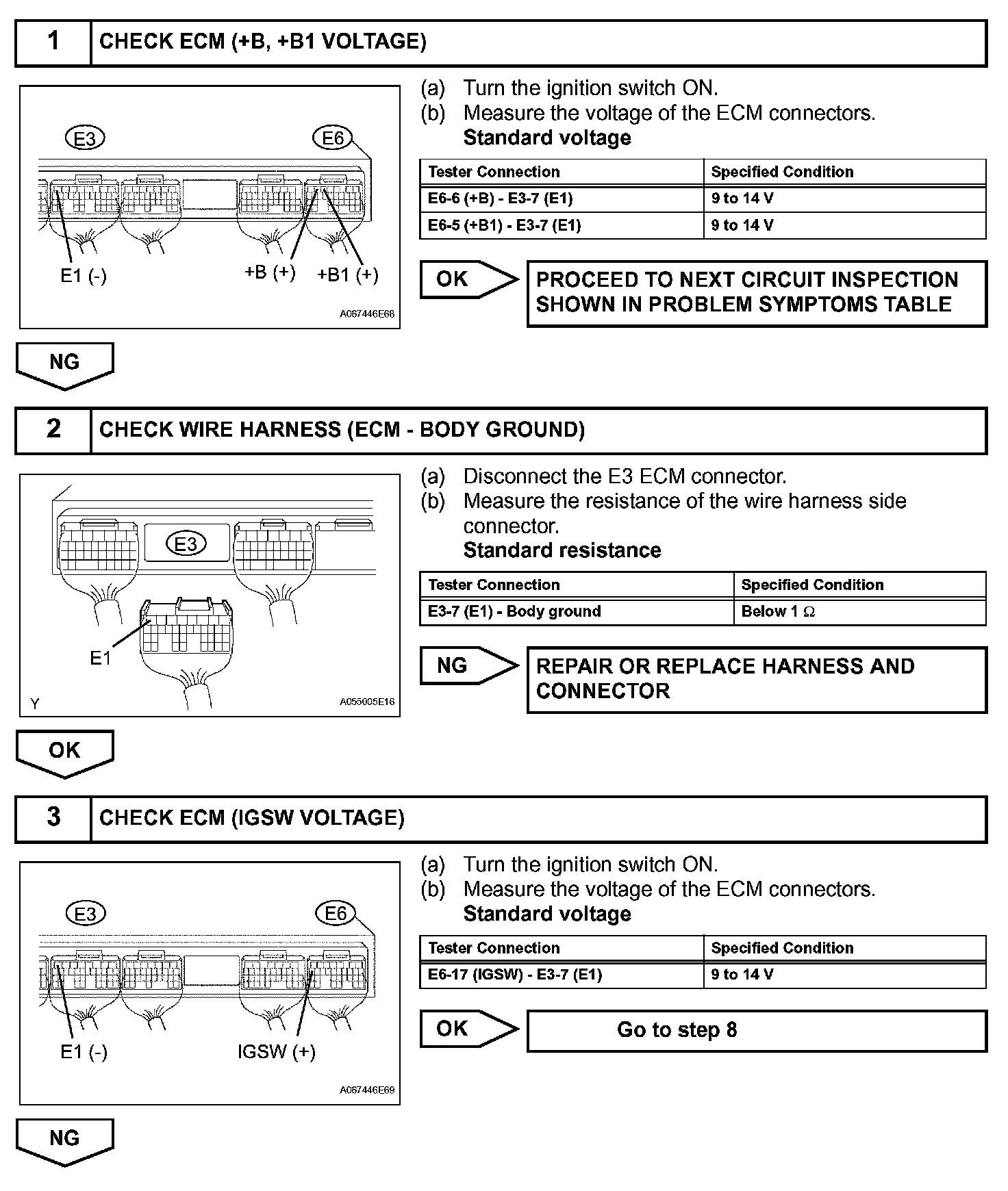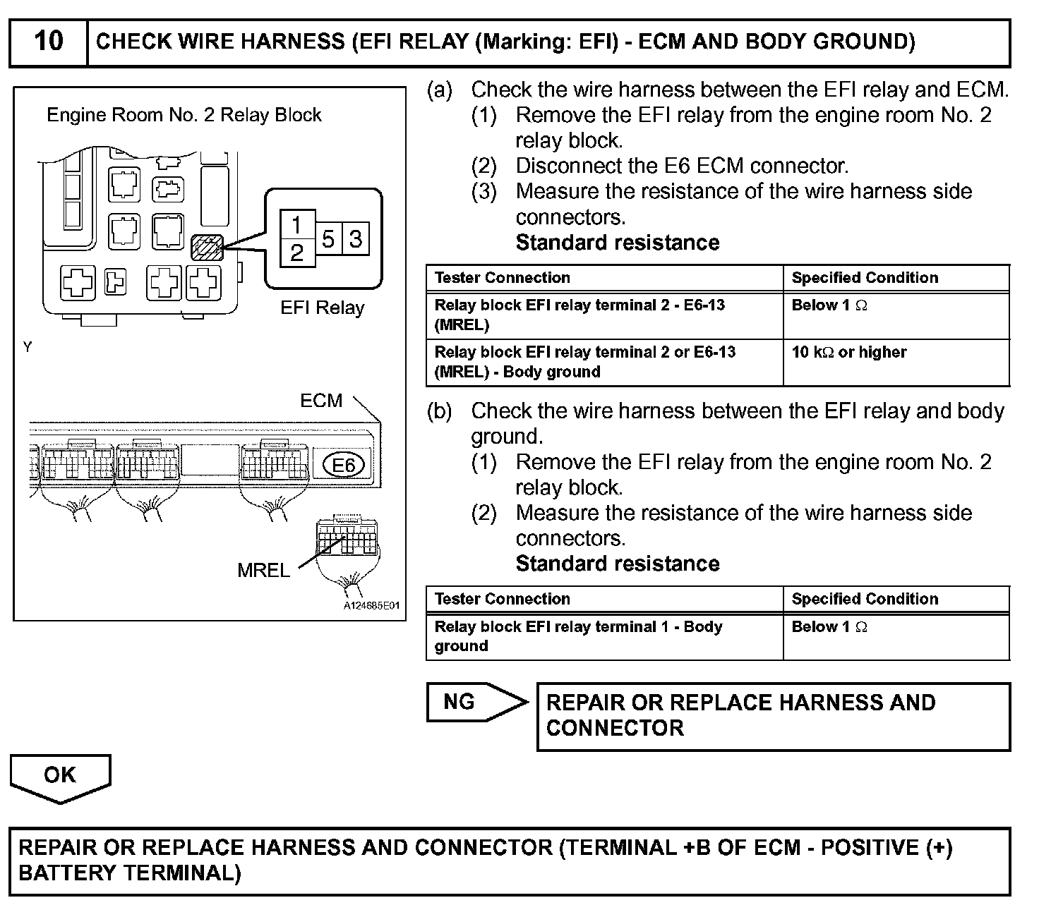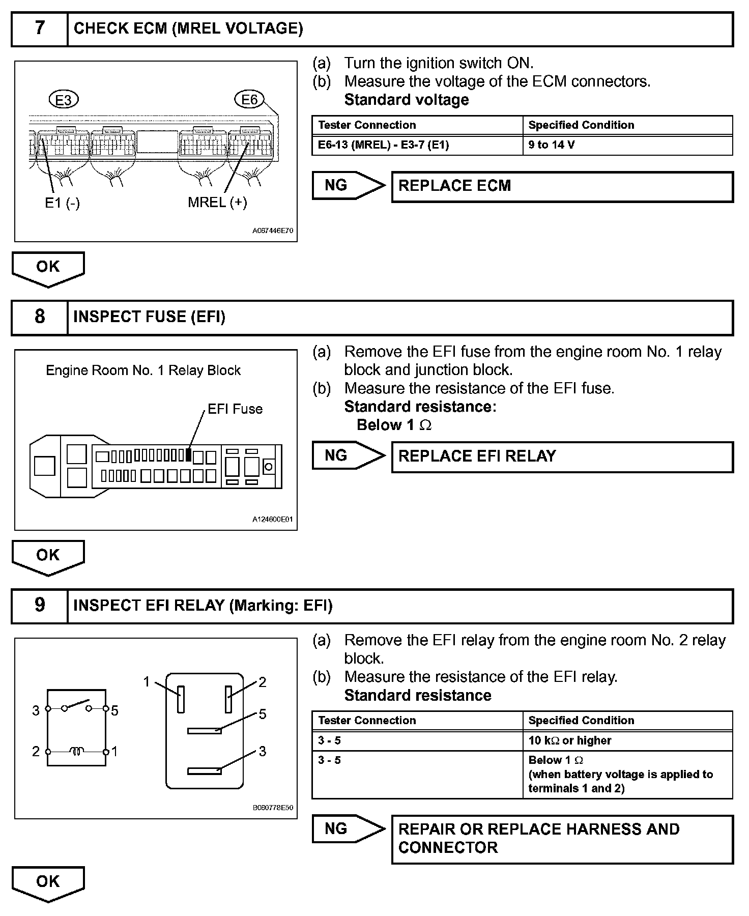 When the ignition switch is turned ON, the battery voltage is applied to terminal IGSW of the ECM. The ECM MREL output signal causes a current to flow to the coil, closing the contacts of the EFI (Marking: EFI MAIN) relay and supplying power to terminal +B of the ECM.