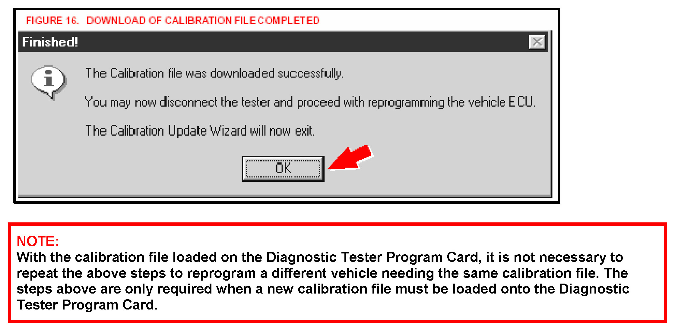 The Diagnostic Tester now has the calibration file stored and you may proceed to the next step to reprogram the vehicle ECU.