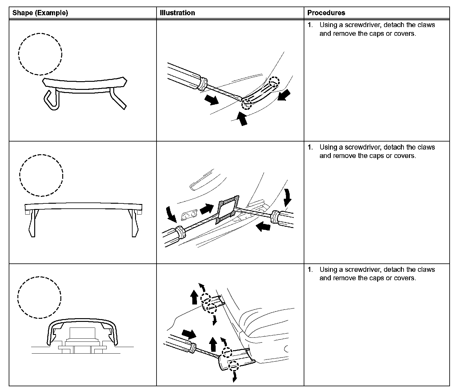 1. The removal and installation methods of typical claws used for vehicle body parts are shown in the table.