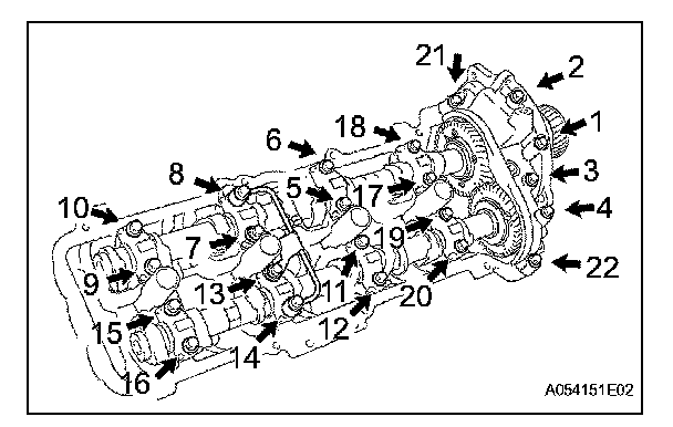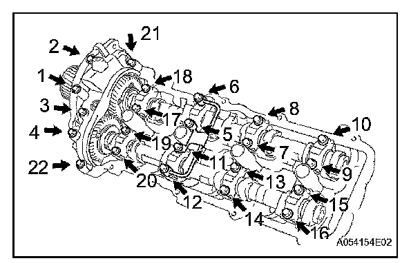 Uniformly tighten the 22 bearing cap bolts in several passes in the sequence shown in the illustration.