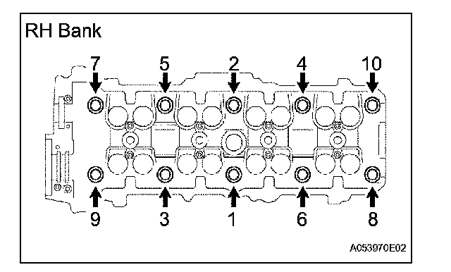 Install and uniformly tighten the 10 cylinder head bolts, and plate washers in the sequence shown in the illustration.