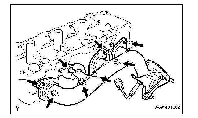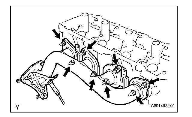 Install the exhaust manifold with 8 new nuts. Uniformly tighten the nuts in several passes.