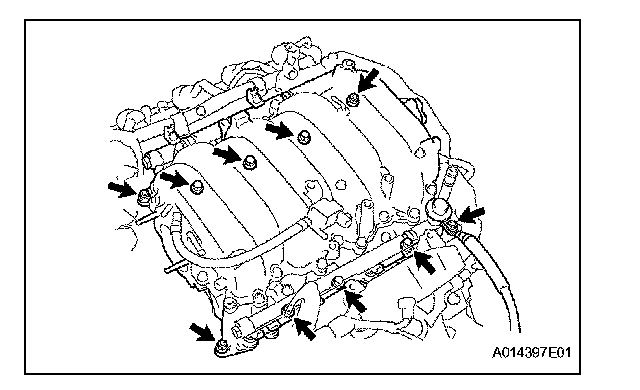 INTAKE MANIFOLDInstall the intake manifold assembly with the 6 bolts and 4 nuts.
