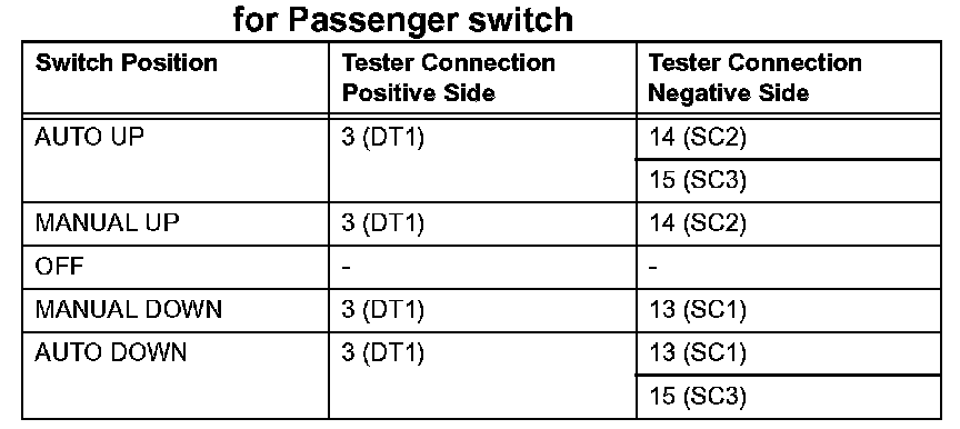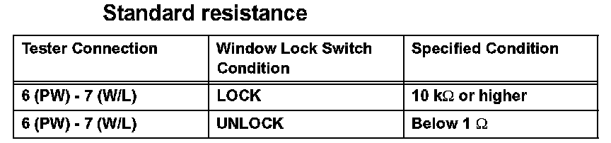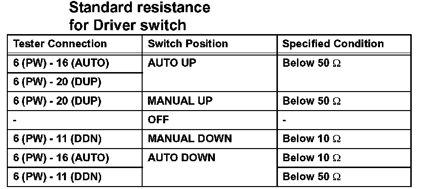 If the result is not as specified, replace the master switch assembly.