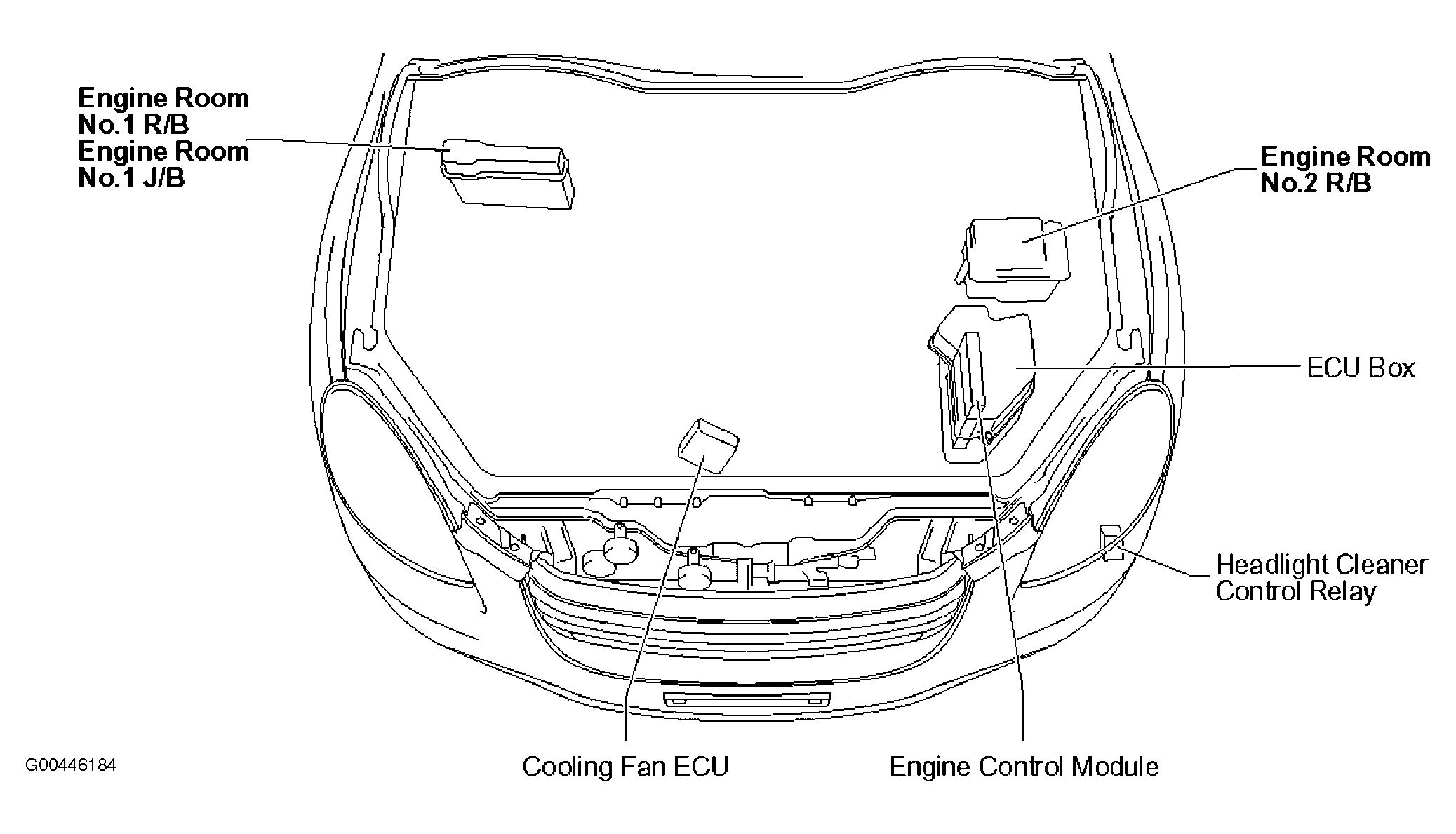 | Cooling Fan ECU | In front of engine compartment, near cooling fan assembly. See Figure. |