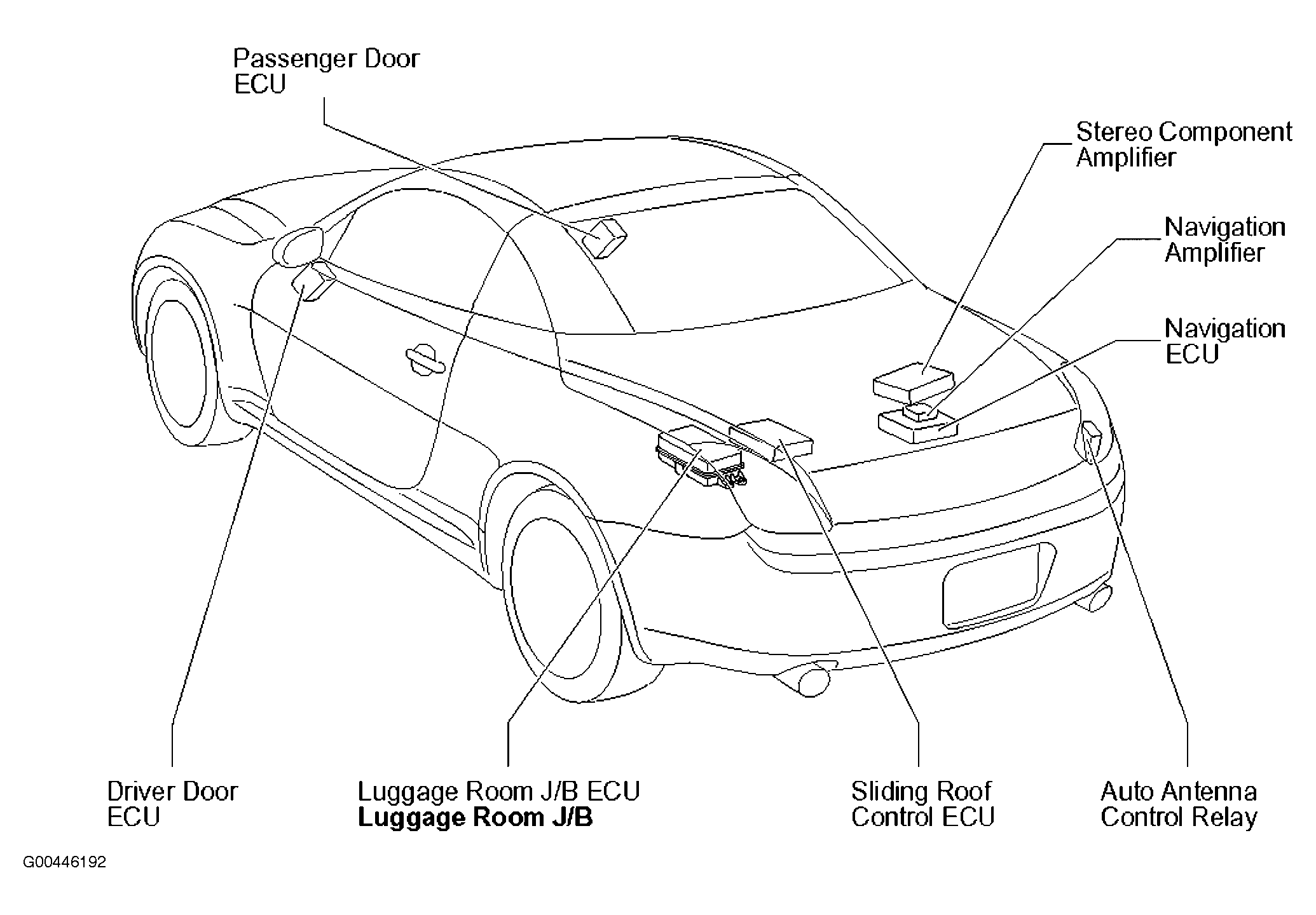 | Navigation ECU | At right rear corner of luggage compartment. See Figure. |