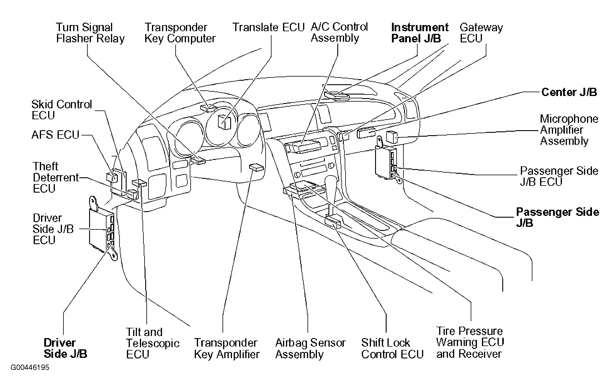 | Driver Side J/B ECU | Behind left kick panel. See Figure. |