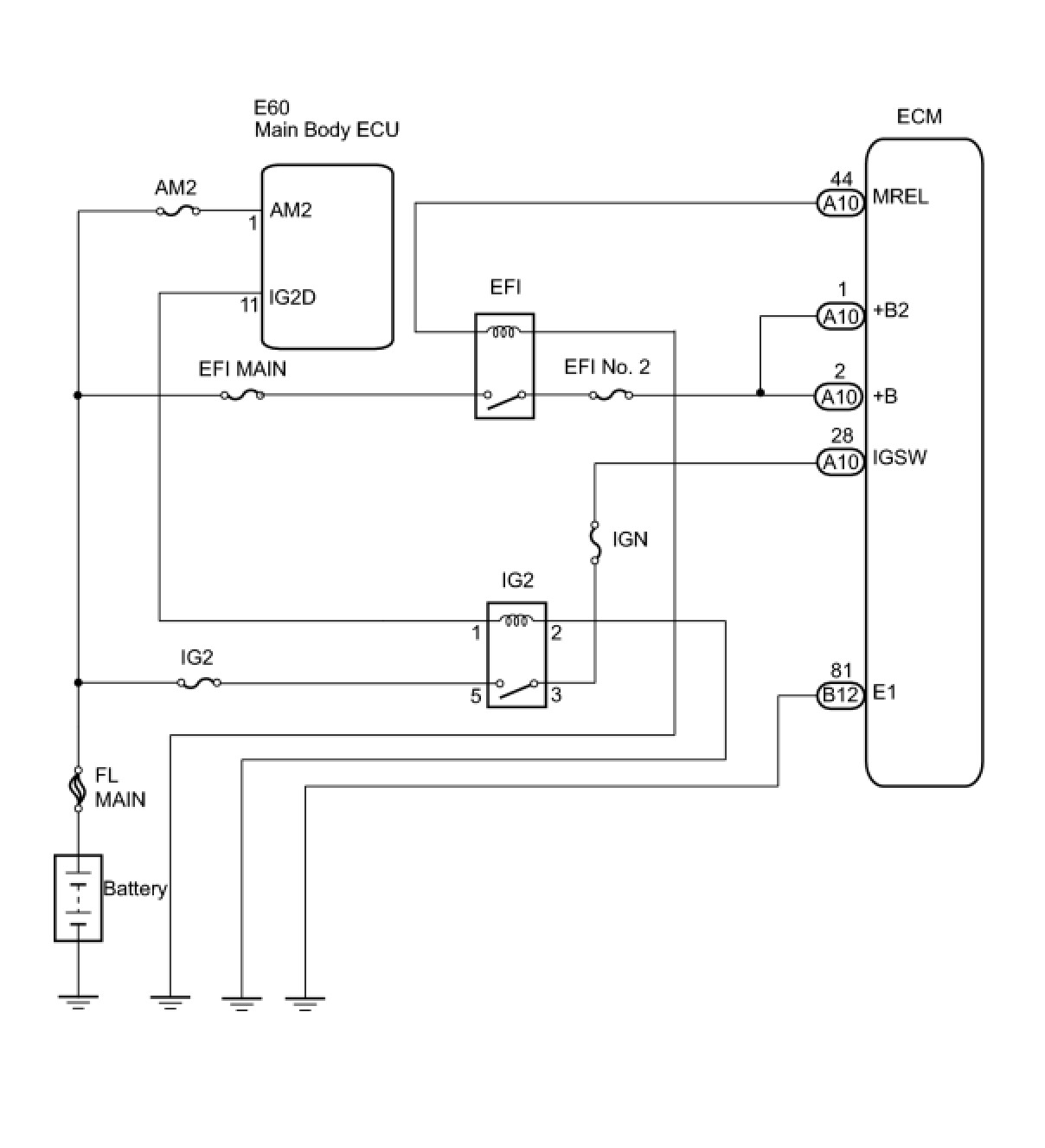 When the engine switch is turned on (IG), the battery voltage is applied to terminal IGSW of the ECM. The ECM MREL output signal causes a current to flow to the coil, closing the contacts of the EFI MAIN relay and supplying power to terminal +B of the ECM.
