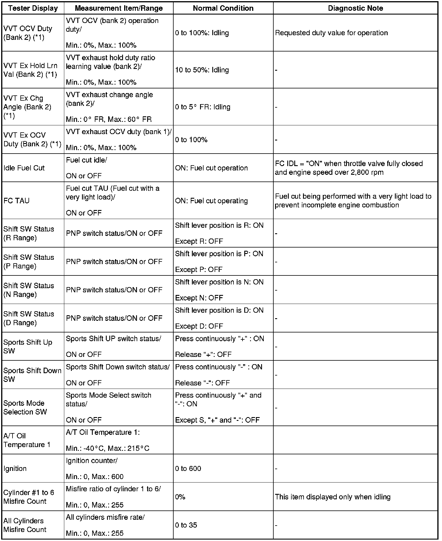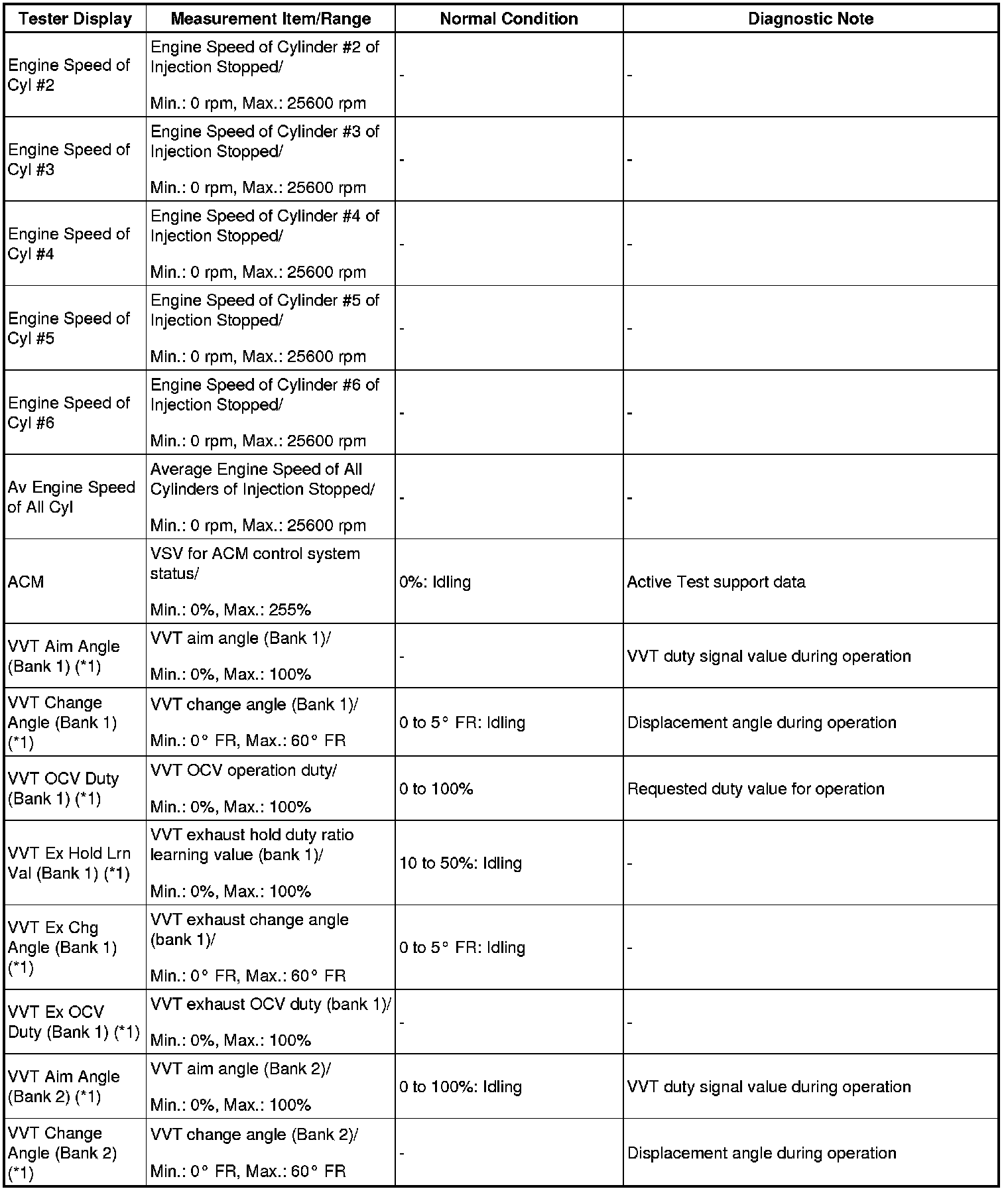 - *: Data List values are displayed only when performing the following Active Test: Control the VVT Linear (Bank 1 or Bank 2) or Control the VVT Exhaust Linear (Bank 1 or Bank 2). For other Active Test, the Data List value will be 0.