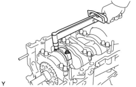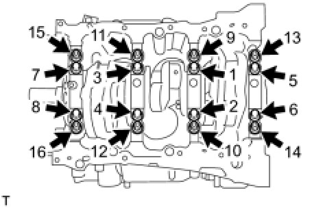 Install 8 new seal washers and uniformly tighten the 8 main bearing cap bolts in several steps and in the sequence shown in the illustration.