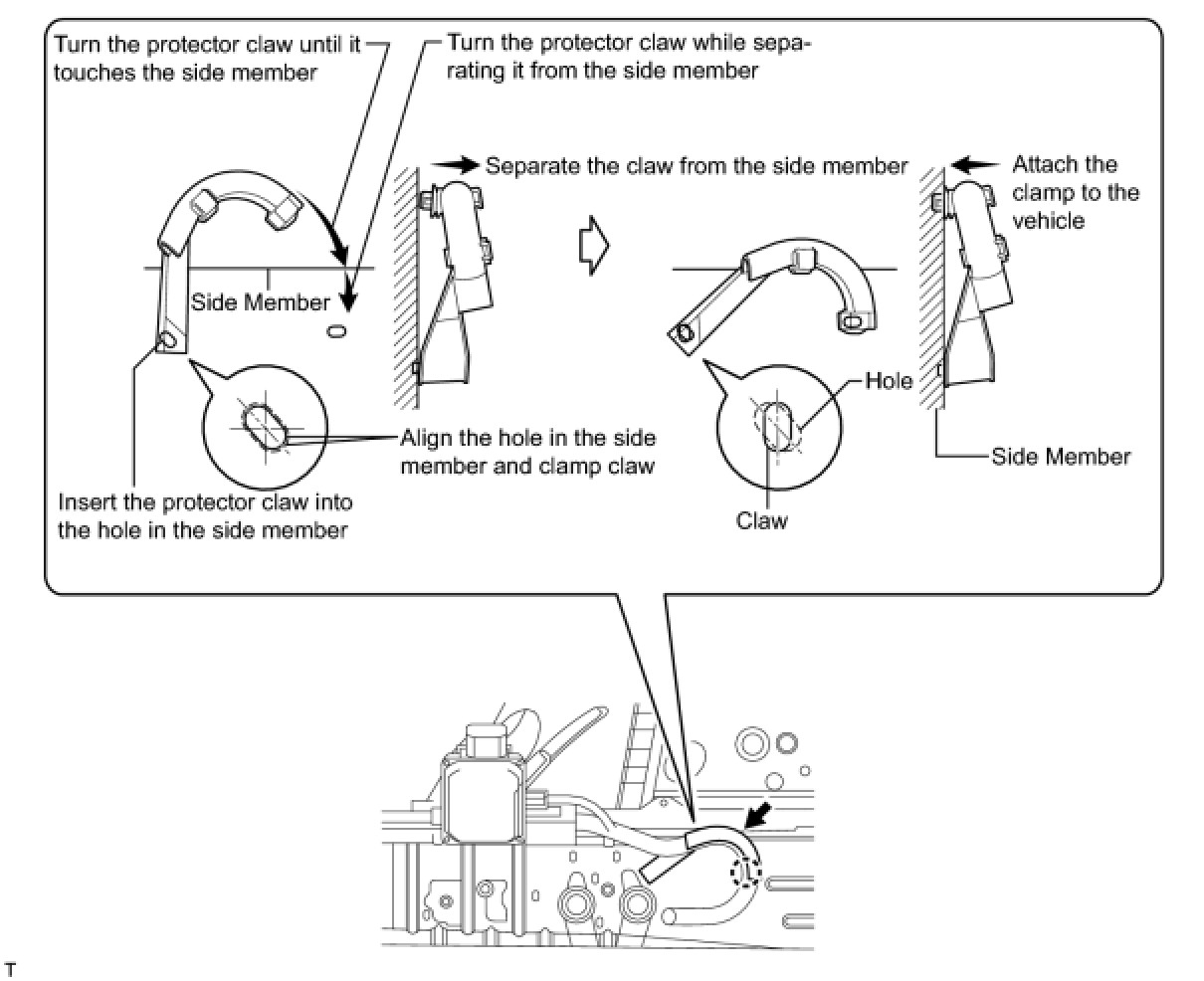 (k) Turn the wire harness protector to align the claw and the clamp installation hole, and install the protector to the vehicle.