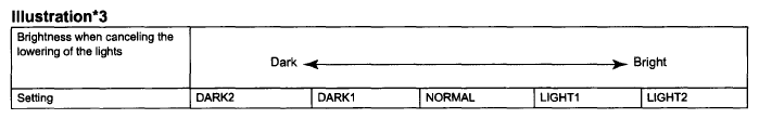 LIGHT CONTROL REFERENCE CHARTDisplay Default Contents Setting Light Auto OFF Delay 30s Function to keep on lighting the headlight for a certain period of time after closing all the doors with the power switch turned from ON to OFF under the condition that the light control switch is at HEAD or AUTO with the headlight ON OFF / 30s / 60s / 90s Sensitivity NORMAL Function to adjust the sensitivity of lighting illumination*1. LIGHT2 / LIGHT1 / NORMAL / DARK1 / DARK2 Disp Ex ON Sen NORMAL Changes brightness when lowering lights such as combination meter indicator light, A/C indicator light, and clock light. Refer to Fig 2for illustration*2. LIGHT2 / LIGHT1 / NORMAL / DARK1/DARK2 Disp Ex OFF Sen NORMAL Changes brightness when lowering lights such as combination meter indicator light, A/C indicator light, and clock light. Refer to Fig 3for illustration*3. LIGHT2 / LIGHT1 / NORMAL / DARK1/DARK2 Foot Light Time (Driver's Side)*4 15s Function to set how long foot light stays on (driver's side) OFF / 7.5s / 15s / 30s Foot Light Time (Passenger's Side)*4 15s Function to set how long foot light stays on (passenger's side) OFF/7.5s / 15s / 30s Foot Light Set up ON Function to light up foot light ON / OFF DRL Function* ON DRL control ON / OFF HINT: