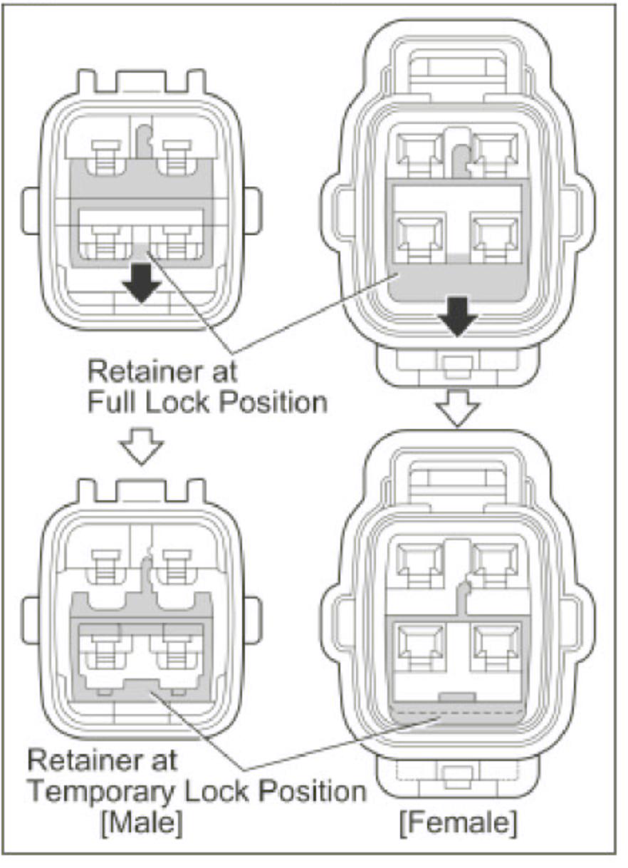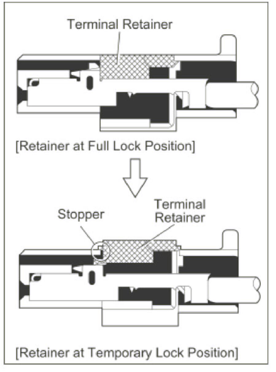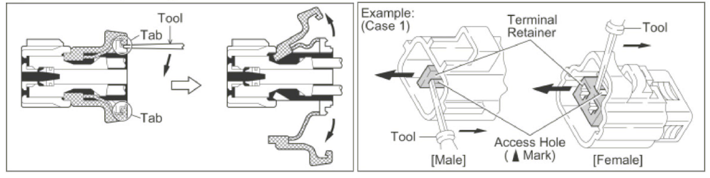 Insert the special tool into the terminal retainer access hole (/\ Mark) and pull the terminal retainer up to the temporary lock position.