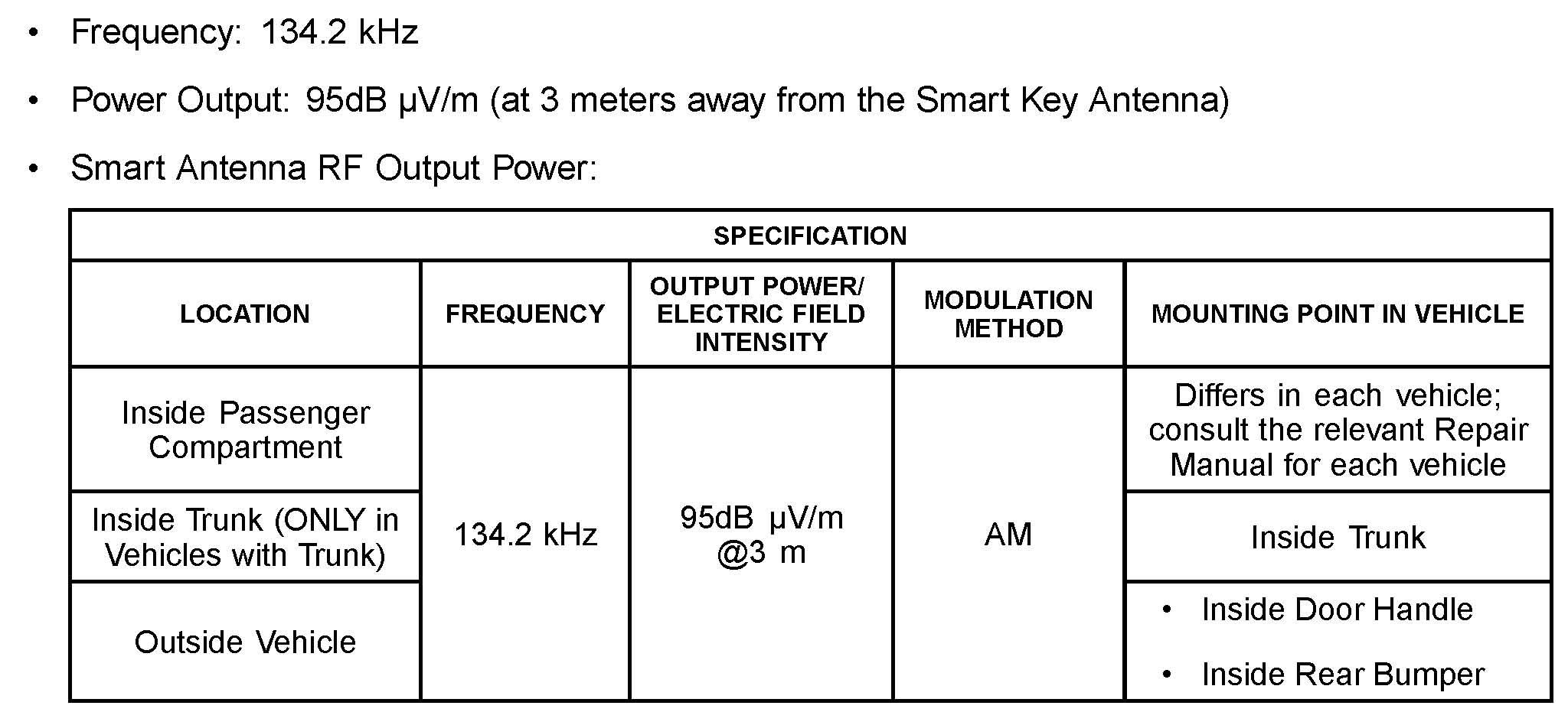 Some customers may inquire about the frequency and power output of the Smart Key/Smart Entry Systems used on various models. The Smart Key/Smart Entry systems conform to all applicable FCC rules. This bulletin details the applicable specifications for these systems.