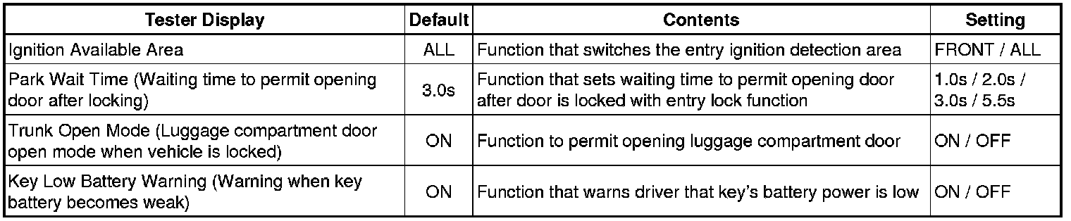 (a) To change the vehicle to entry unlock mode switching function, make sure the vehicle power is off and simultaneously press and hold the electrical key's LOCK switch and another electrical key switch for 5 seconds.