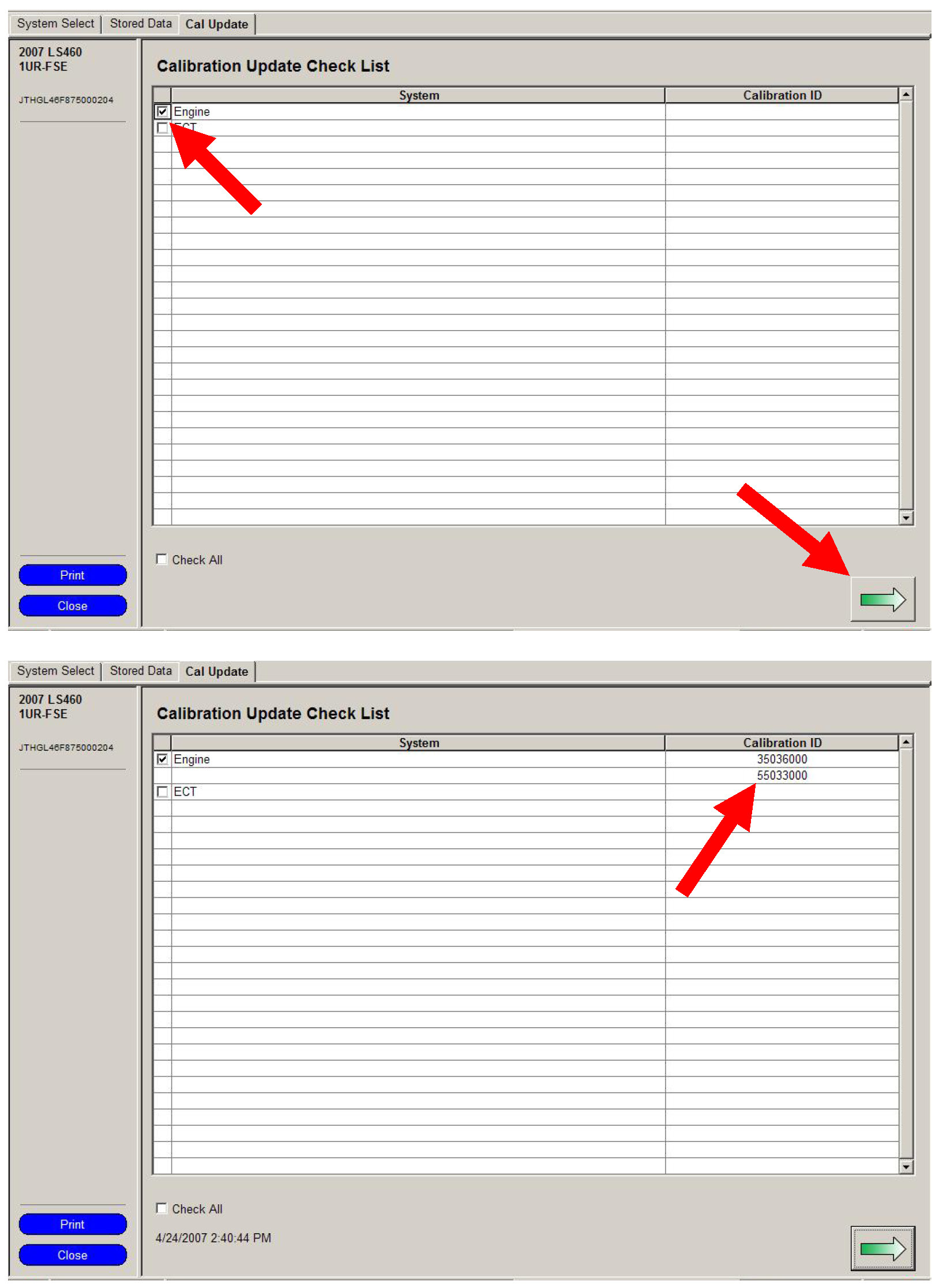 d. Click the green arrow button (bottom right of screen) to retrieve current calibration ID(s)