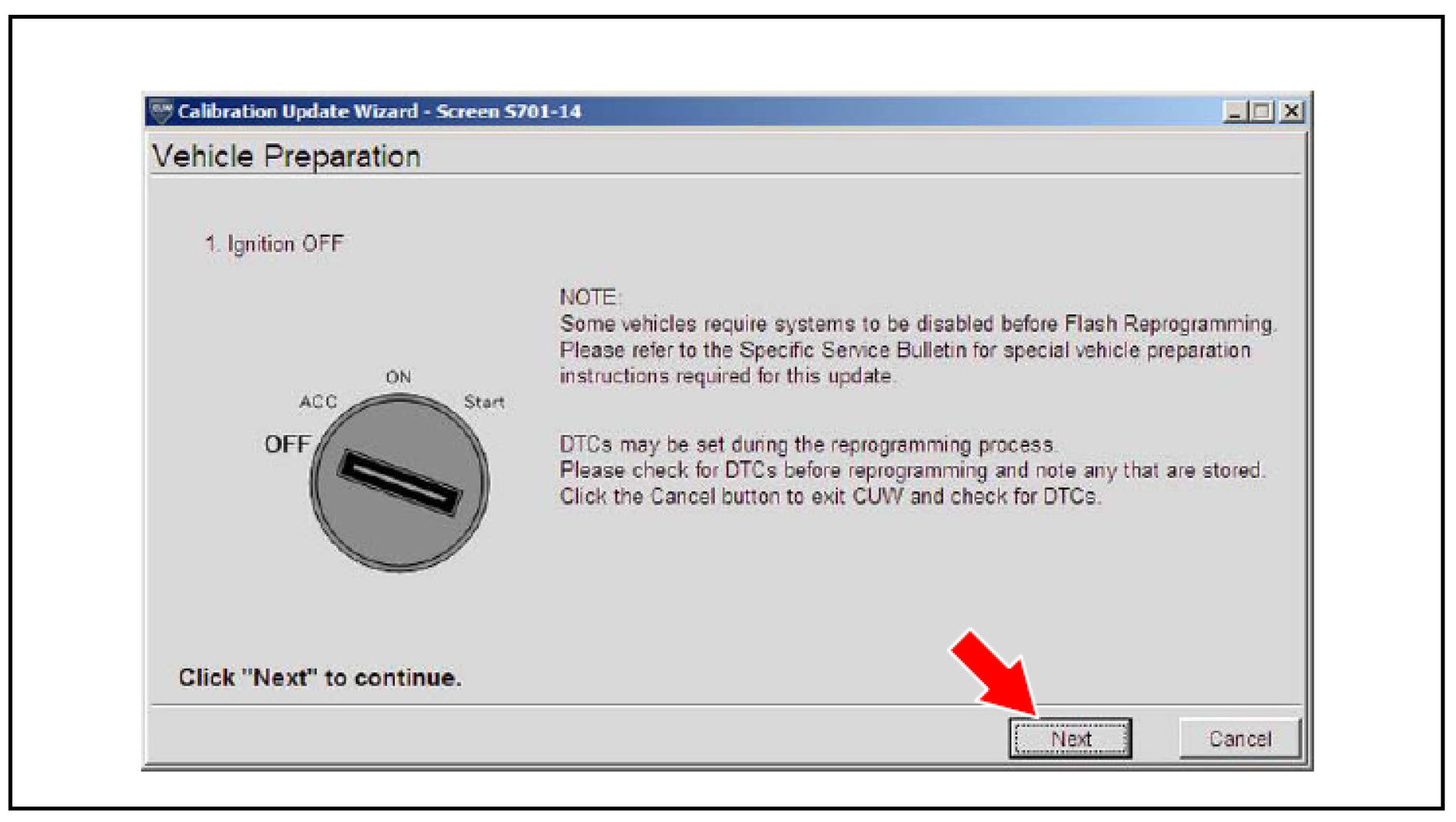 B. Click Next to start the calibration update process.