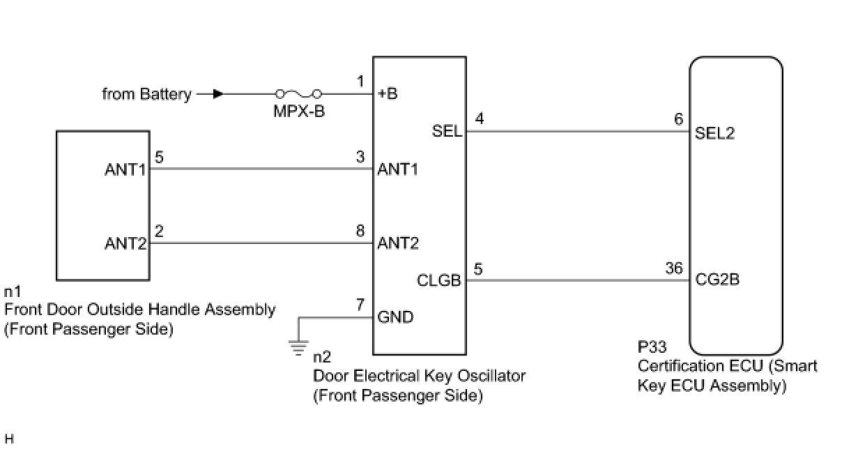 When the front passenger door entry lock and unlock functions do not operate, any of the following may be malfunctioning: 1) power door lock control system, 2) door electrical key oscillator (front passenger side), or 3) certification ECU (smart key ECU assembly).