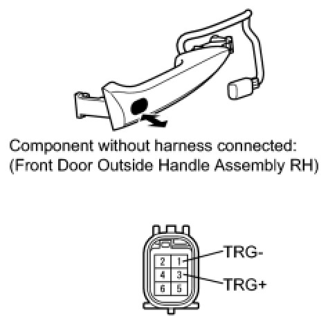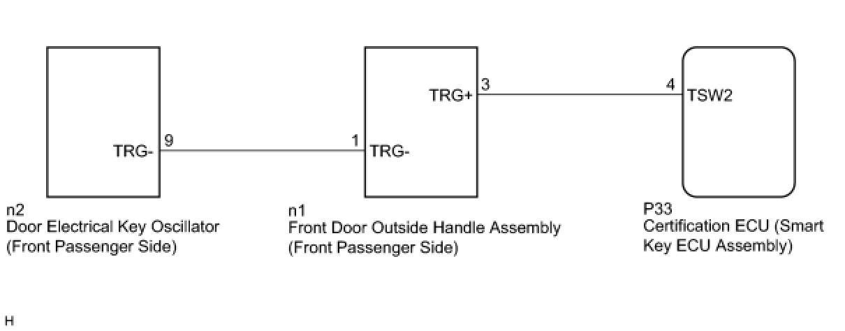 If the front passenger side door entry lock function does not operate but the entry unlock function operates, the communication line between the vehicle and electrical key transmitter is normal. Any of the following components may have a malfunction: 1) touch sensor circuit certification ECU (smart key ECU assembly); 2) front door outside handle assembly (front passenger side); or 3) door electrical key oscillator (front passenger side).