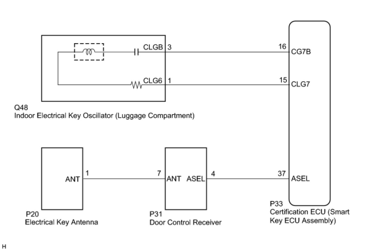 If the entry luggage compartment lock-in prevention function does not operate, either of the following may be the cause: 1) communication between the indoor electrical key oscillator (luggage compartment) and electrical key antenna cannot be performed; or 2) a malfunction in the certification ECU (smart key ECU assembly).