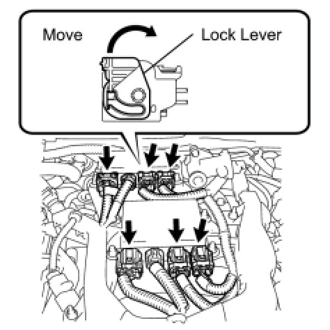 (1) Connect the 6 connectors with wire harness locks and the 2 connectors without wire harness locks to the 2 injector drivers.