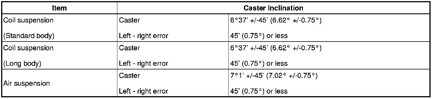 If the caster and steering axis inclination are not within the specified values, after the camber has been correctly adjusted, recheck the suspension parts for damaged and/or worn out parts.