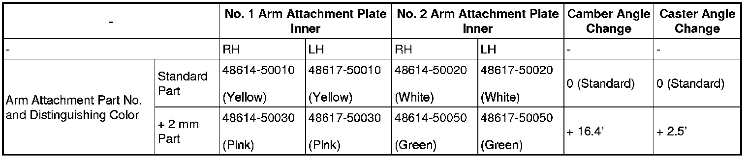 (a) If the front suspension crossmember's left to right camber value is not as specified even though the camber and caster adjustment was performed, replace the No. 1 arm attachment plate inner and No. 2 arm attachment plate inner. Then perform the camber adjustment again.
