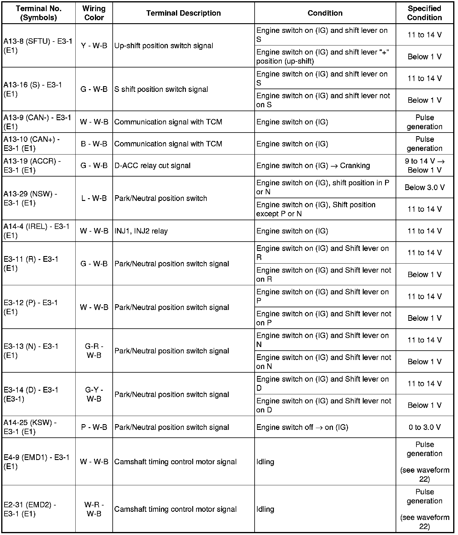 HINT: The standard normal voltage between each pair of the ECM terminals is shown in the table below. The appropriate conditions for checking each pair of the terminals are also indicated. The result of checks should be compared with the standard normal voltage for that pair of terminals, displayed in the Specified Condition column. The illustration above can be used as a reference to identify the ECM terminal locations.
